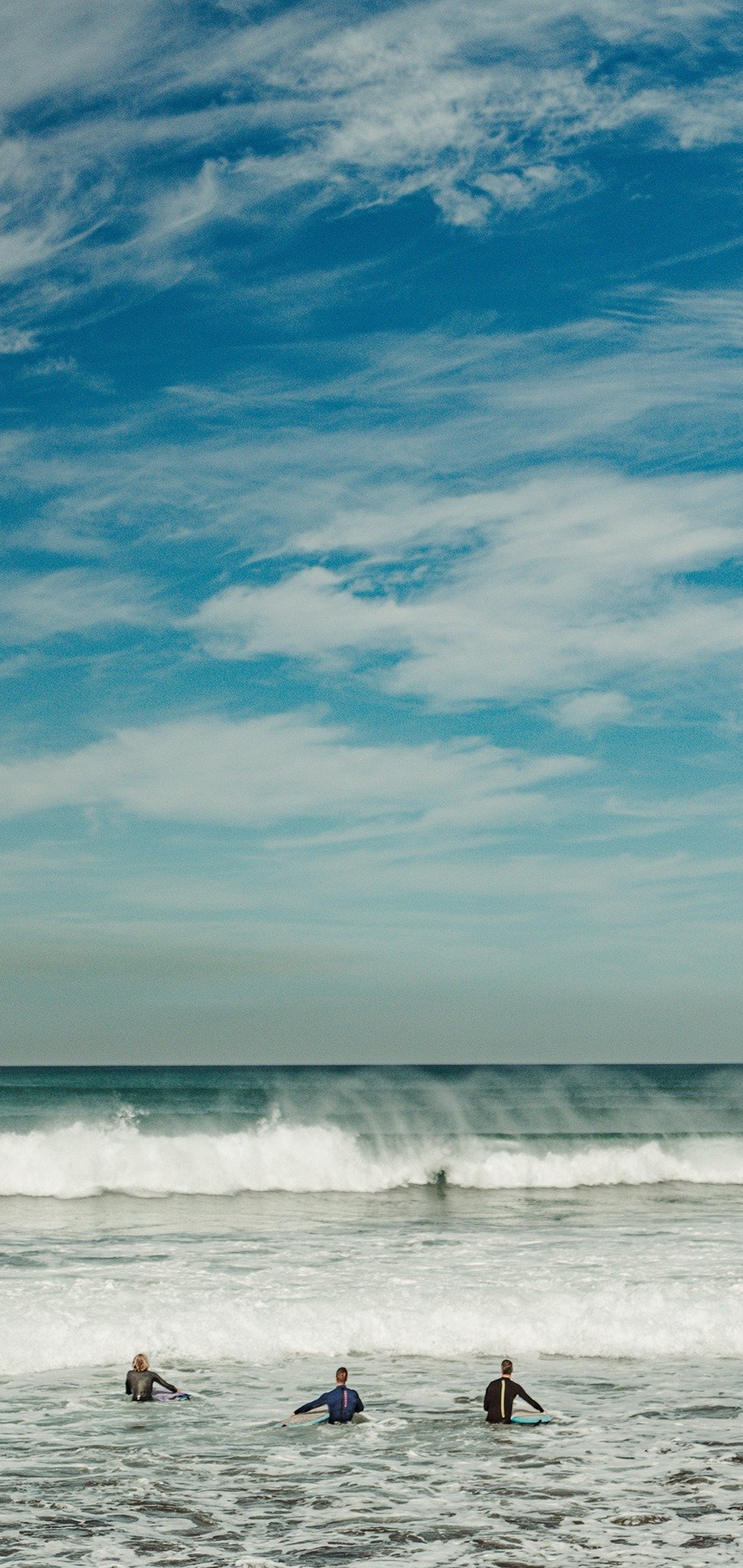해외여행지의 풍경은 이런 모습이 아닐까요? 강한 파도가 이쪽 방향으로 밀려 들어오고 있고 외국인 세 명이 파도타기를 하기 위해 기다리고 있는 모습입니다.