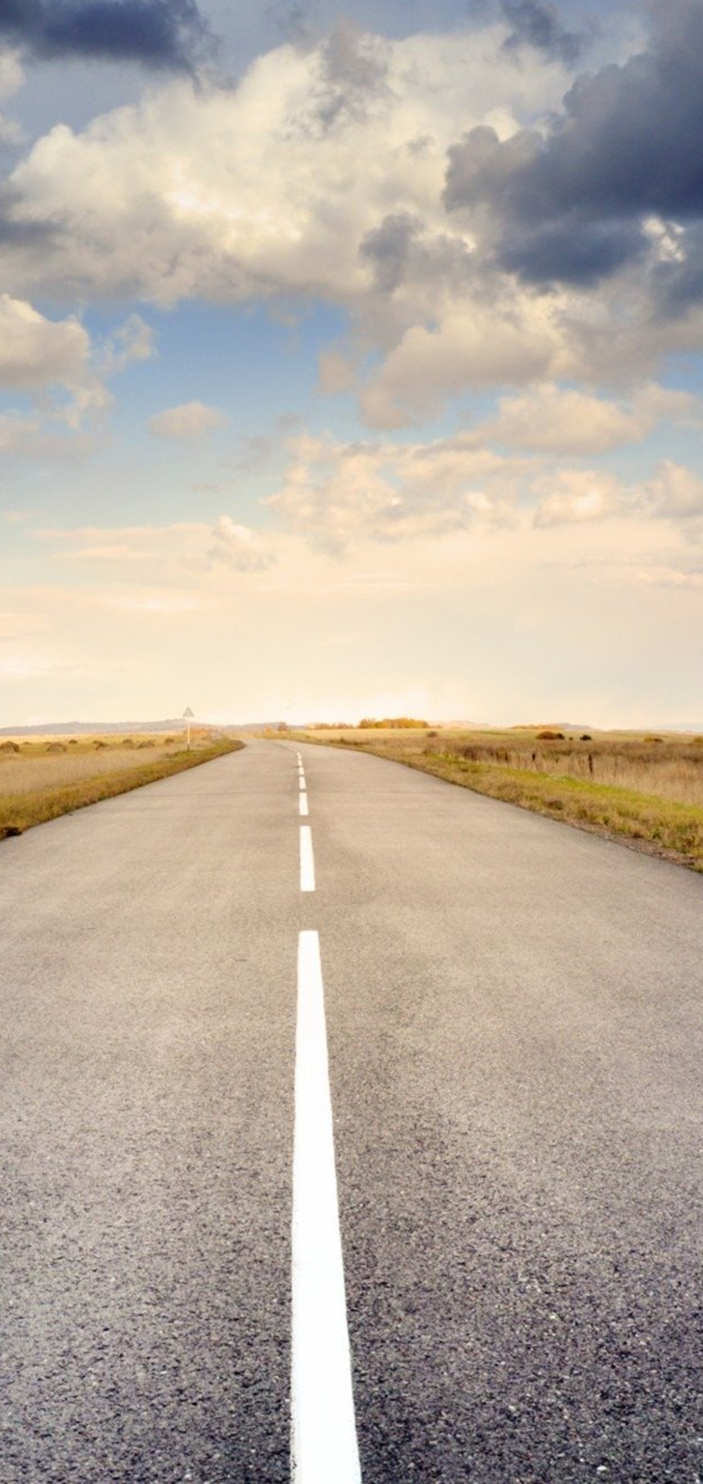 가운데에 흰색 선이 그려져 있는 2차선의 아스팔트 도로입니다. 먹구름도 보이고요.