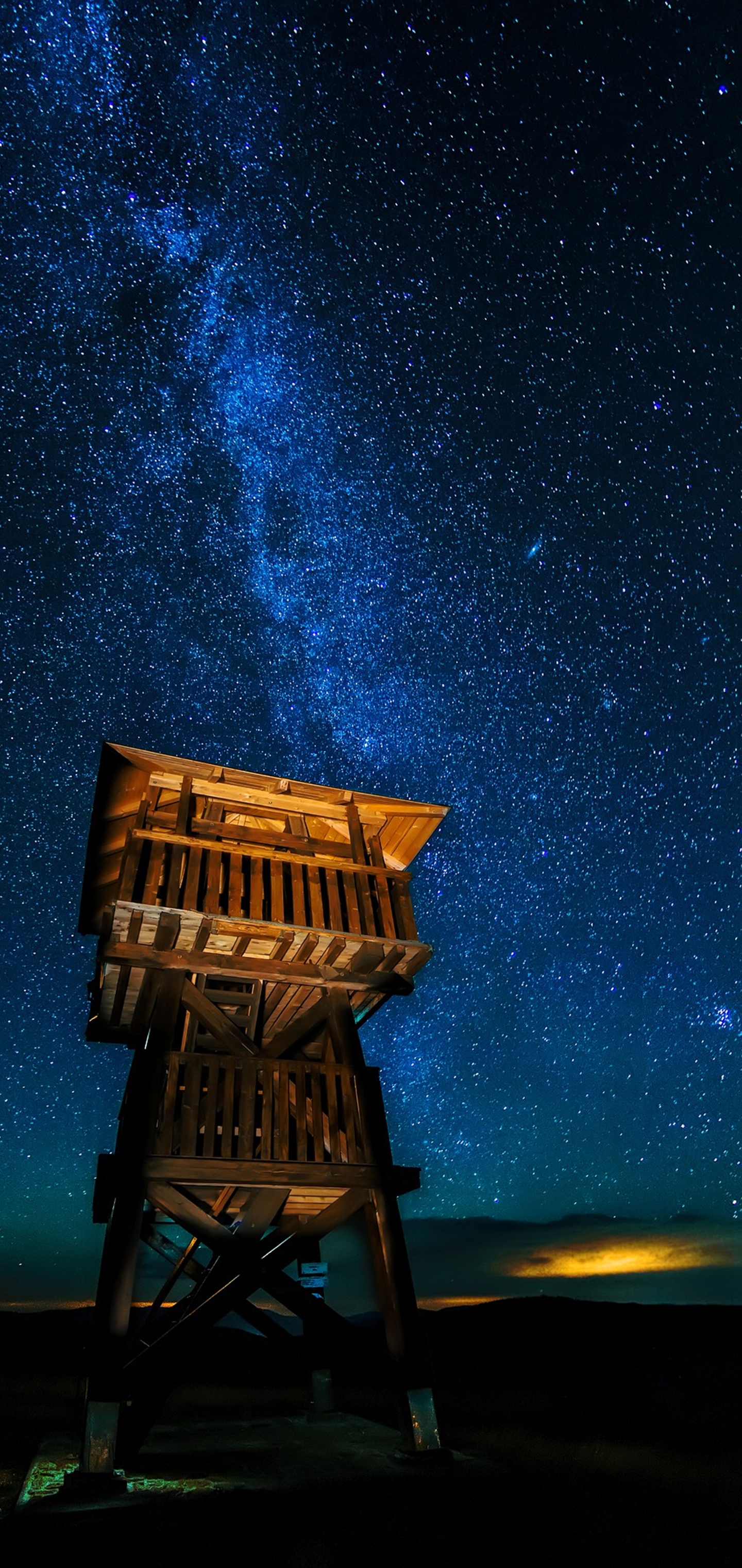 높게 세워진 나무로 만들어진 구조물이고요. 파란빛을 머금고 있는 밤하늘의 별의 풍경이 너무나 아름답네요. 방금 전에 노을이 졌는지 저기 멀리 떨어진 곳에는 노을빛도 살짝 물들어 있습니다. 구조물에 올라가서 은하수와 같은 밤하늘의 풍경을 하루 종일 보고 싶게 만드는 그런 배경화면이고요.