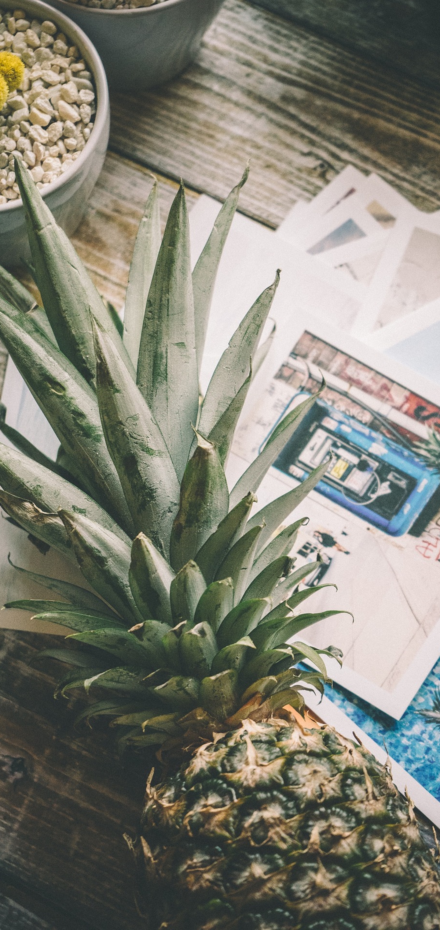 파인애플이 놓여 있는 오래된 책상 위에 잡다한 용지들이 널브러져 있고 왼쪽 위로는 자갈이 올려진 화분이 보이네요. 일상적인 느낌을 잘 담아낸 사진 같고요.