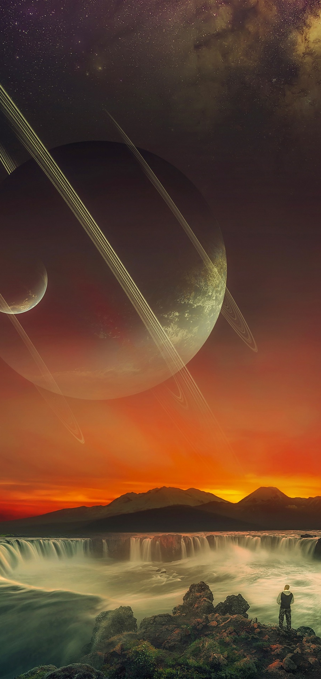 남자가 서 있고 저 멀리 앞에는 폭포가 사방에서 떨어지는 웅장한 느낌의 배경입니다. 그 뒤로는 고리가 있는 거대한 행성이 보이는 것으로 보아, 이곳이 다른 미지의 행성인 것 같네요. 비록 상상도이기는 하지만 개인적으로 이런 미지의 세계나 다른 행성의 느낌이 나는 것을 좋아해서 상상력을 더욱더 자극하네요.