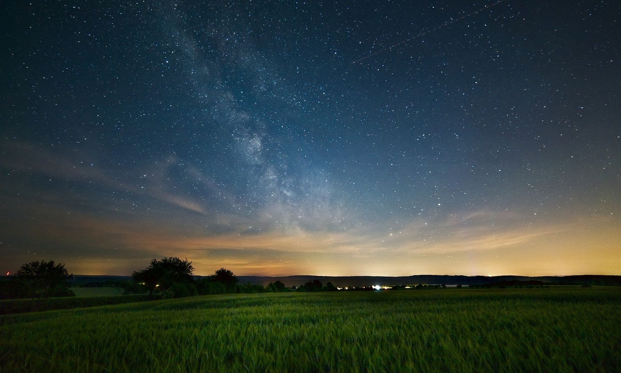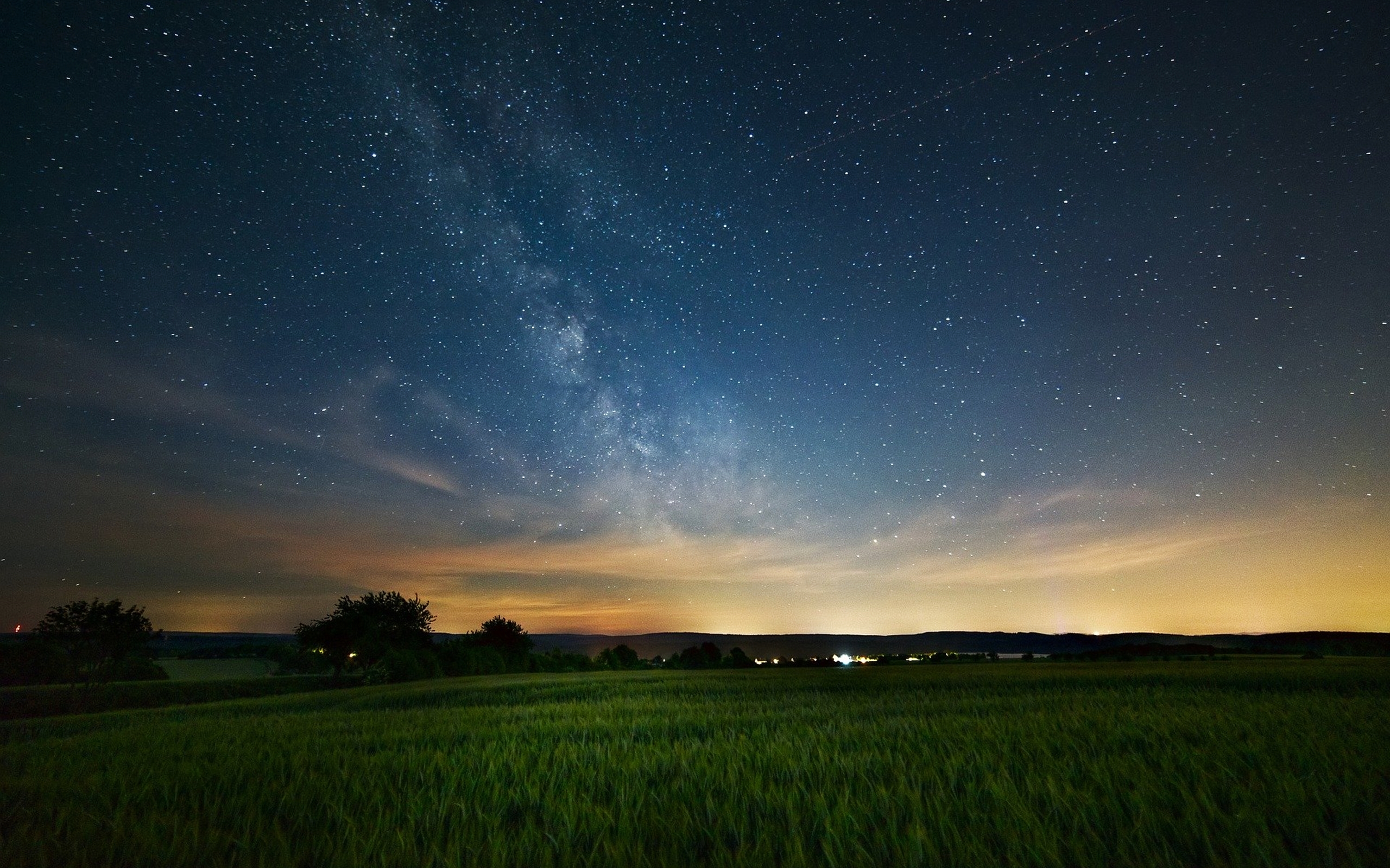 평화롭고 한적해 보이는 시골 풍경입니다. 이곳에도 해가 점점 저물면서 하늘의 수많은 별들이 반짝이고 있습니다.