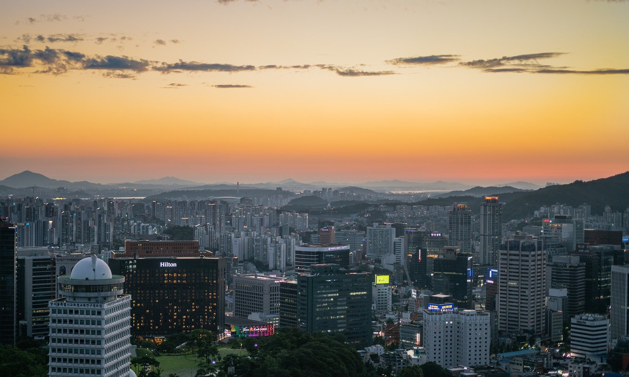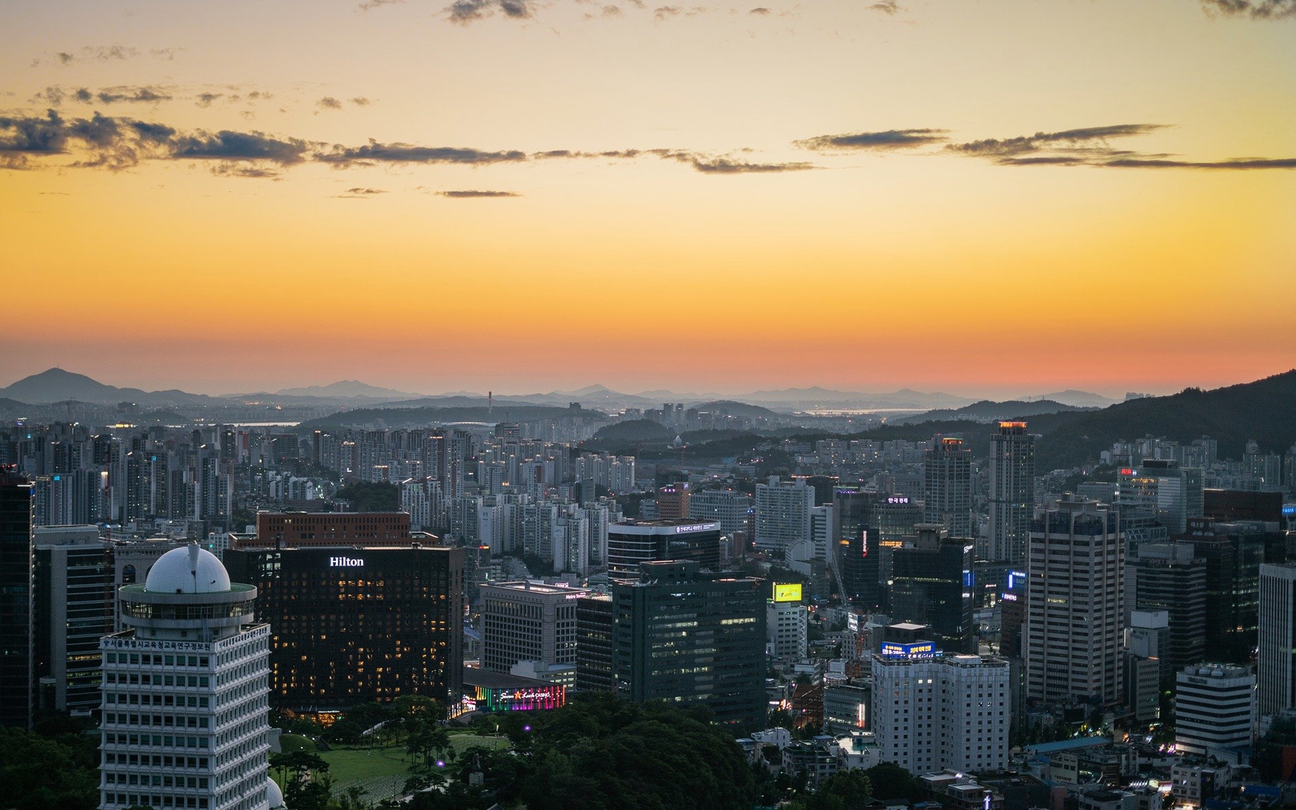 서울 도심 풍경의 모습이고요. 아직은 환한 야경을 보이는 것은 아니지만 해가 지고 있는지 저 먼 곳에 하늘은 노을이 지고 있는 것 같네요. 하늘에 얇은 구름이 떠 있는 모습도 아름답고 평화로워 보이네요.