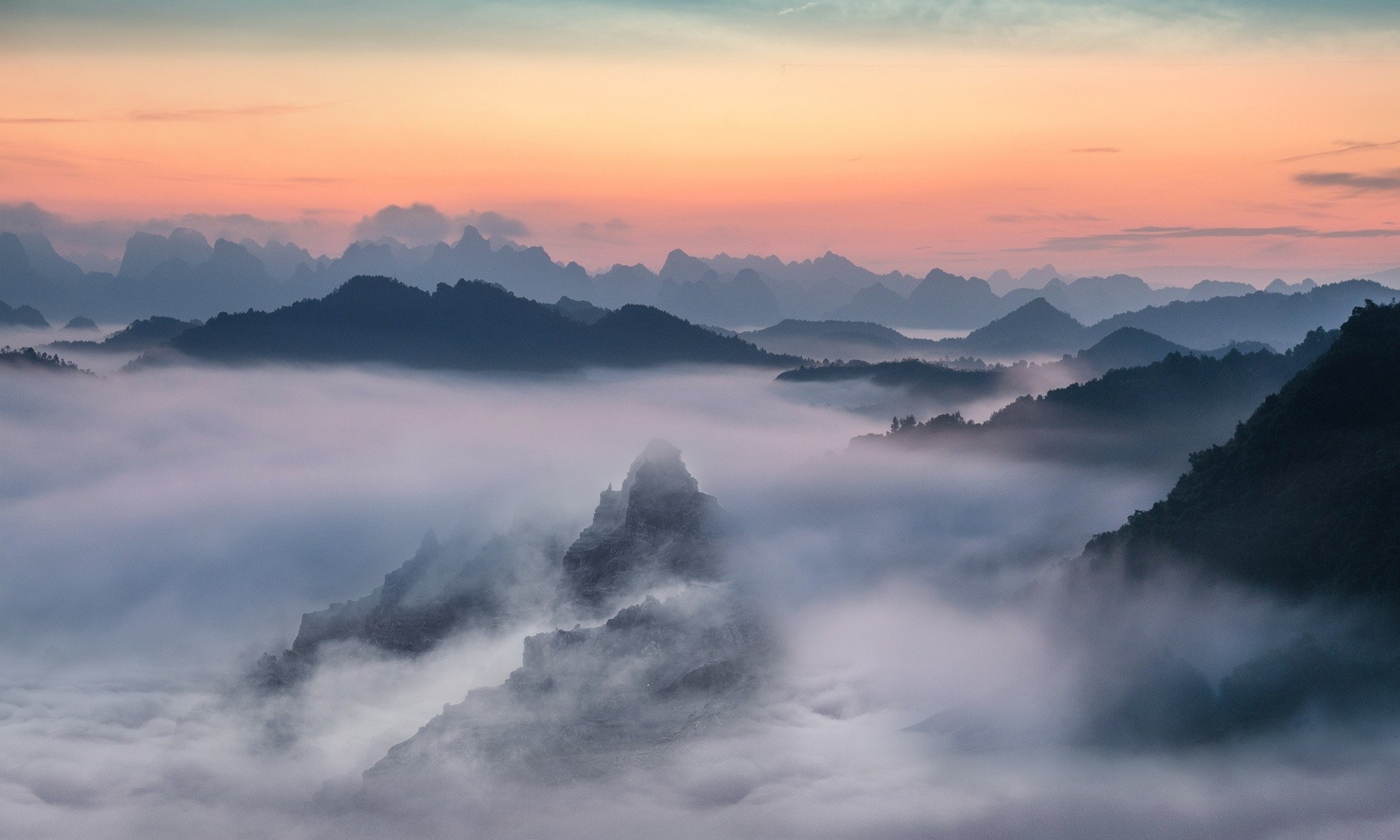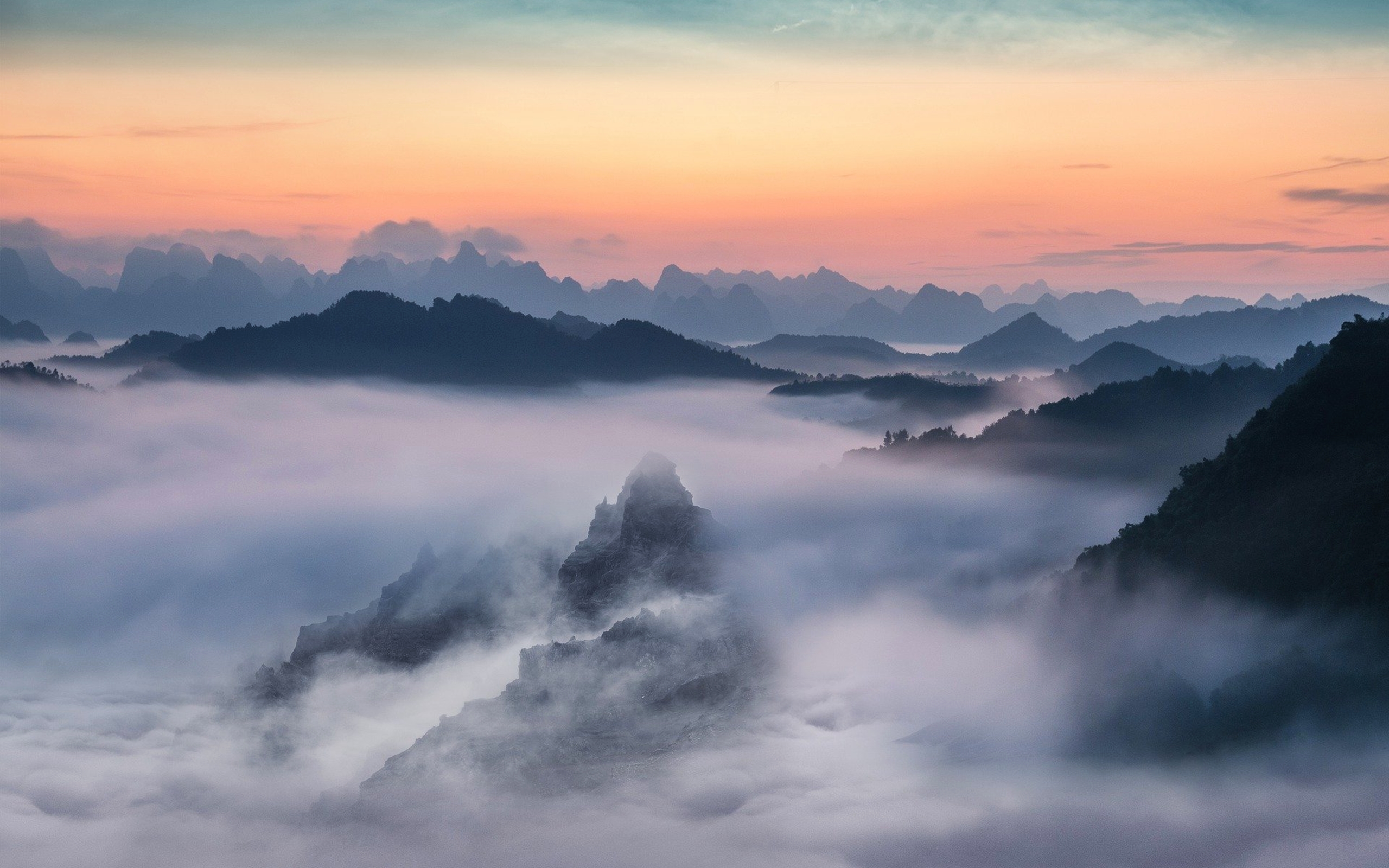 산의 능선을 따라서 안개가 하얗게 퍼져있는 산맥의 모습입니다. 크고 작은 산들이 보이며 저기 저 먼 곳에는 노을이 빨갛게 물들어 있습니다. 아침 또는 새벽의 감성을 잘 전해주네요.