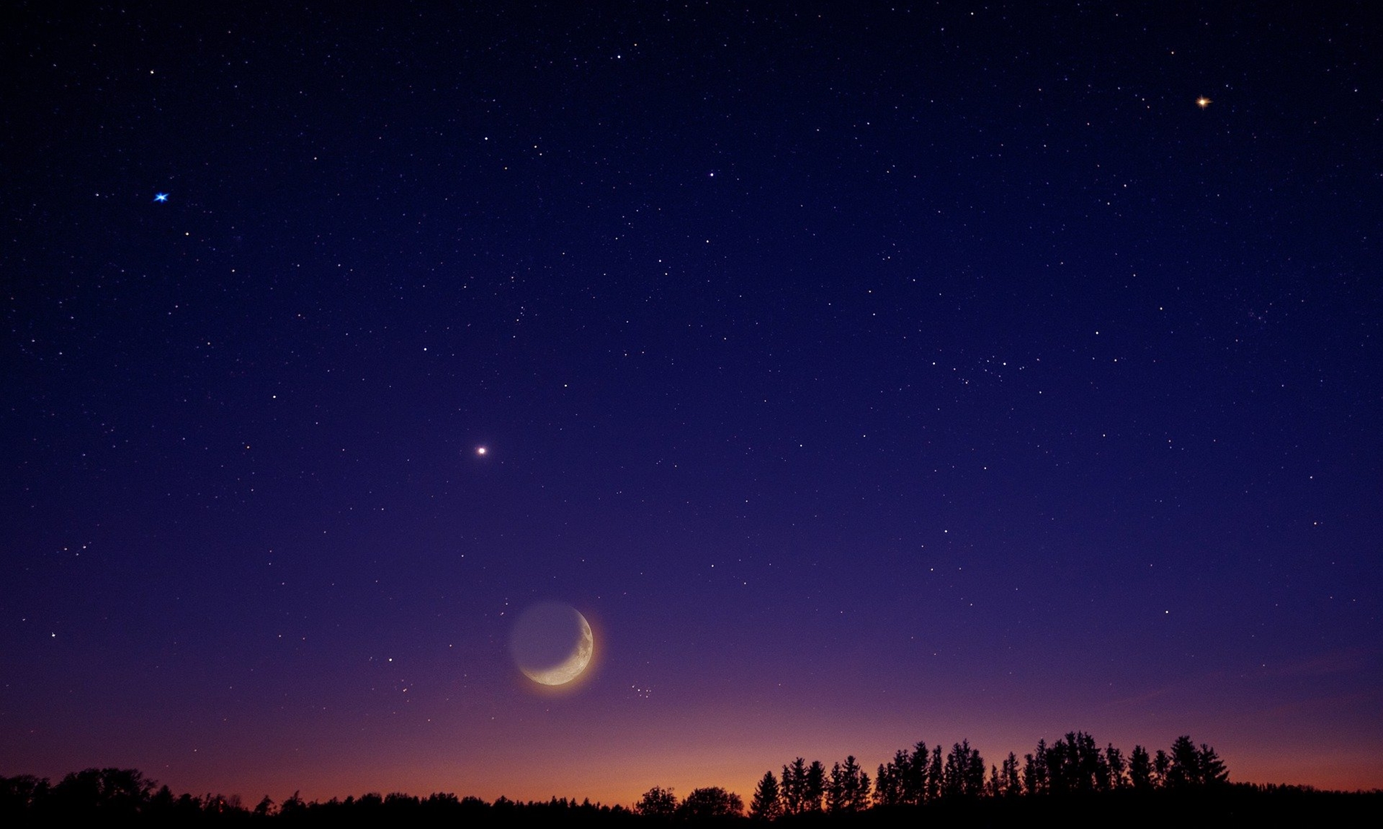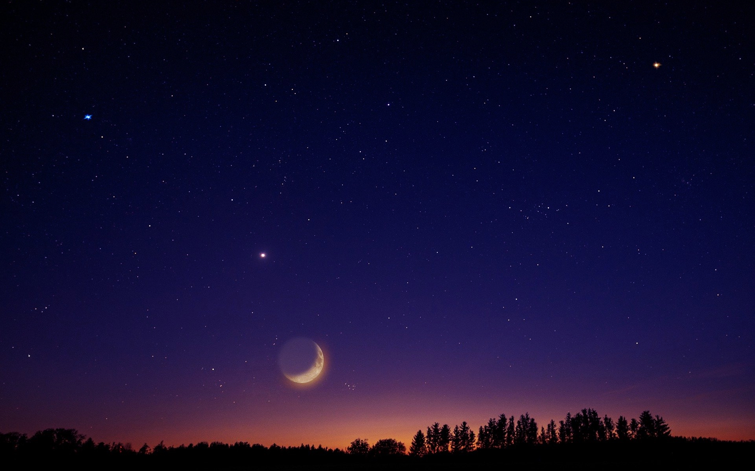 달이 비치고 있는 밤의 모습입니다. 아래에는 몇 그루의 나무들이 보이고 그 위에 초승달의 모습을 하고 있지만 전체적인 둥근 형태의 모양을 하고 있고요. 중간 중간에 밝게 빛나는 별과 조그마한 별들도 적절하게 섞여 있습니다.