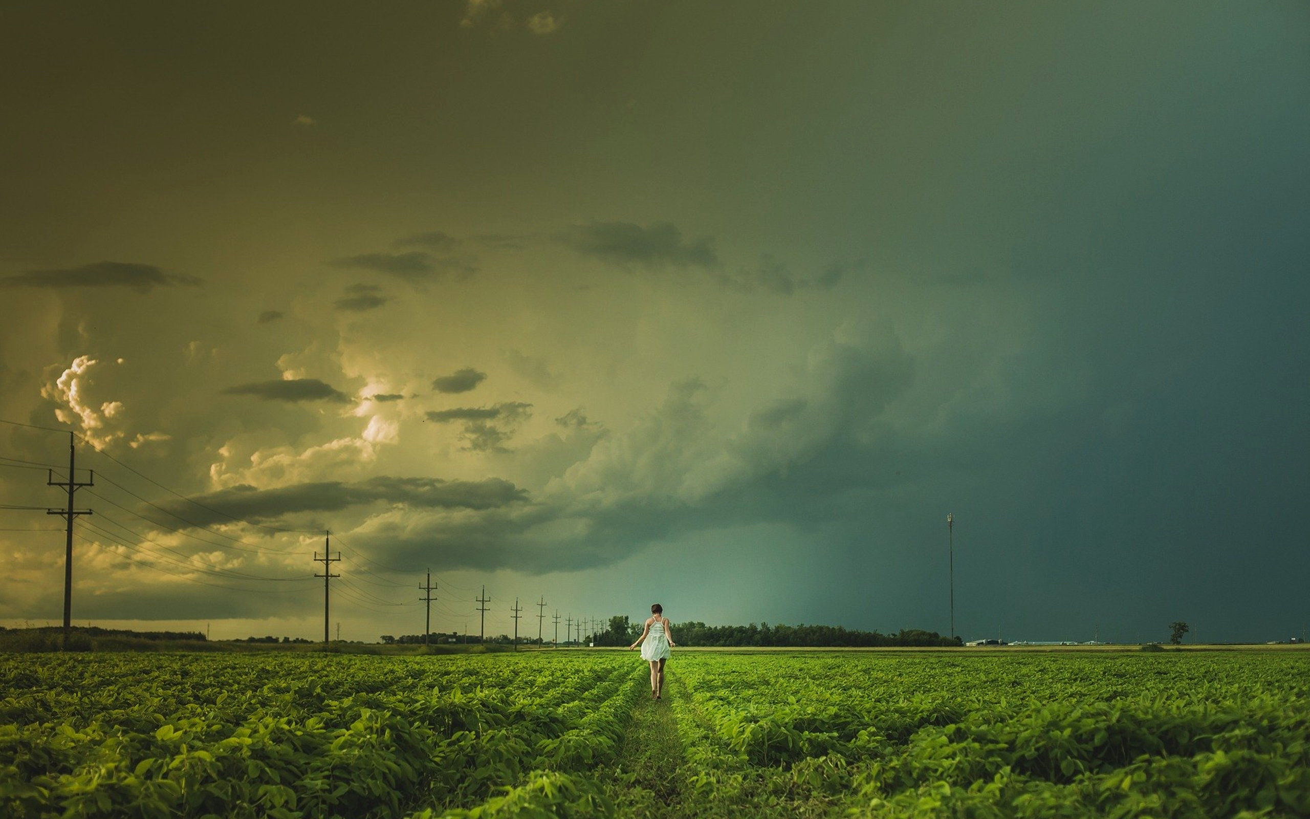 비가 내릴 것 같은 한적한 시골길에 드레스를 입고 걸어가고 있는 풍경의 모습입니다. 사방에는 온통 초록색의 작물들이 자라있고 그 가운데로 작은 길을 따라 등을 지고 걸어가는 모습이 분위기가 있네요. 하늘에는 구름이 가득해서 그런지 조금만 있으면 비가 내릴 것 같은 느낌이 들고요. 왼쪽에는 전봇대가 일렬로 늘어서 있습니다.