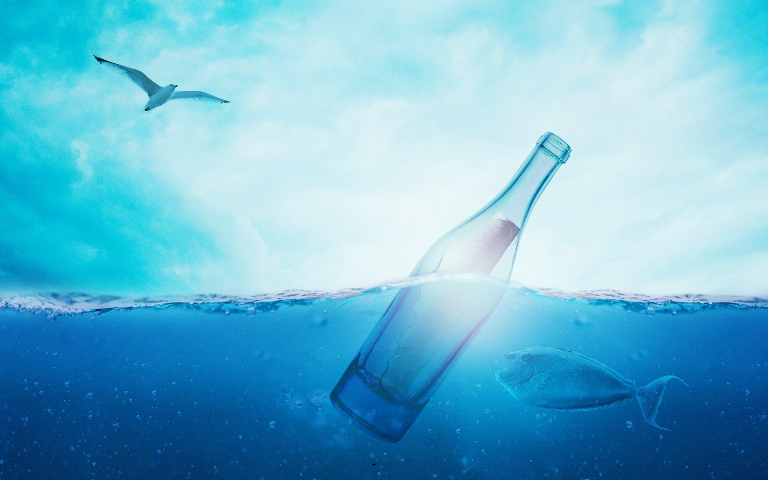 바닷가에 종이가 들어가 있는 병이 둥둥 떠 있고 하늘에는 새가 그리고 수면 밑에는 물고기가 헤엄치고 있네요. 사방이 파란색으로 표현이 된 일러스트 이미지이기 때문에 시원한 느낌을 전해줍니다.