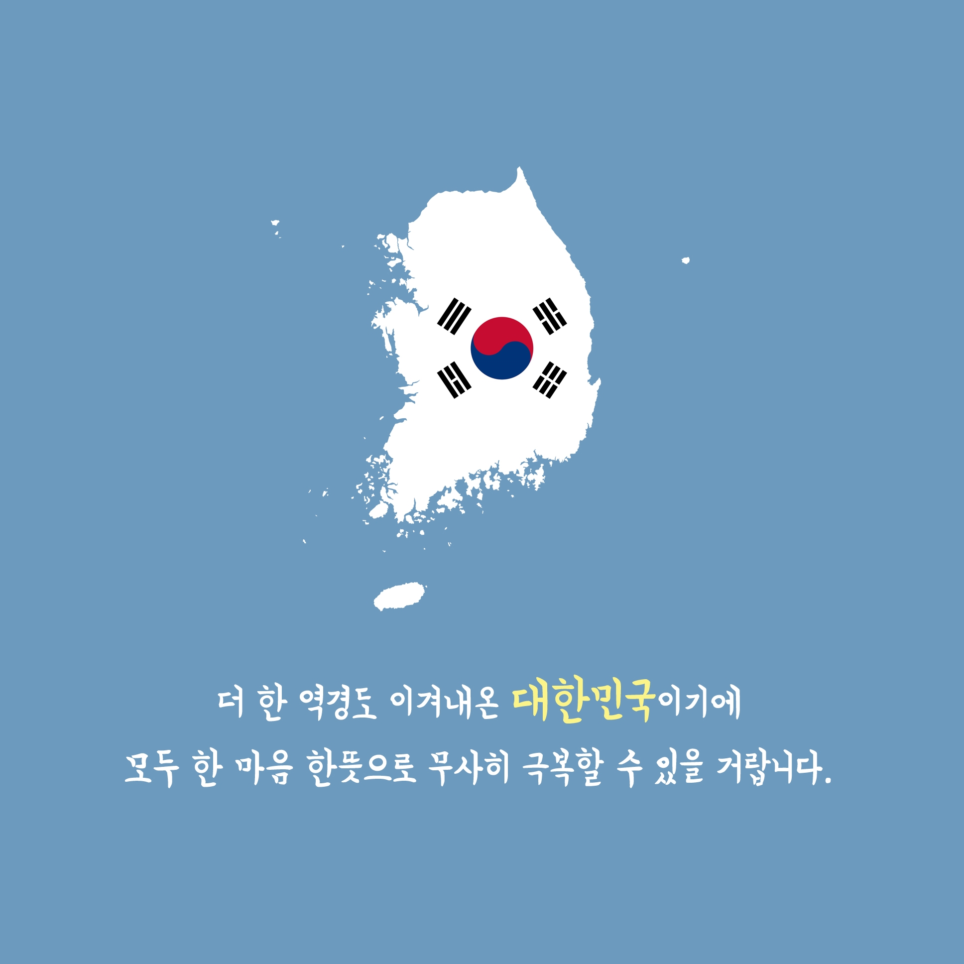 수많은 고난과 역경도 잘 이겨내왔던 것처럼 이번 코로나19도 모두 한마음 한뜻으로 잘 극복할 수 있을 거랍니다.