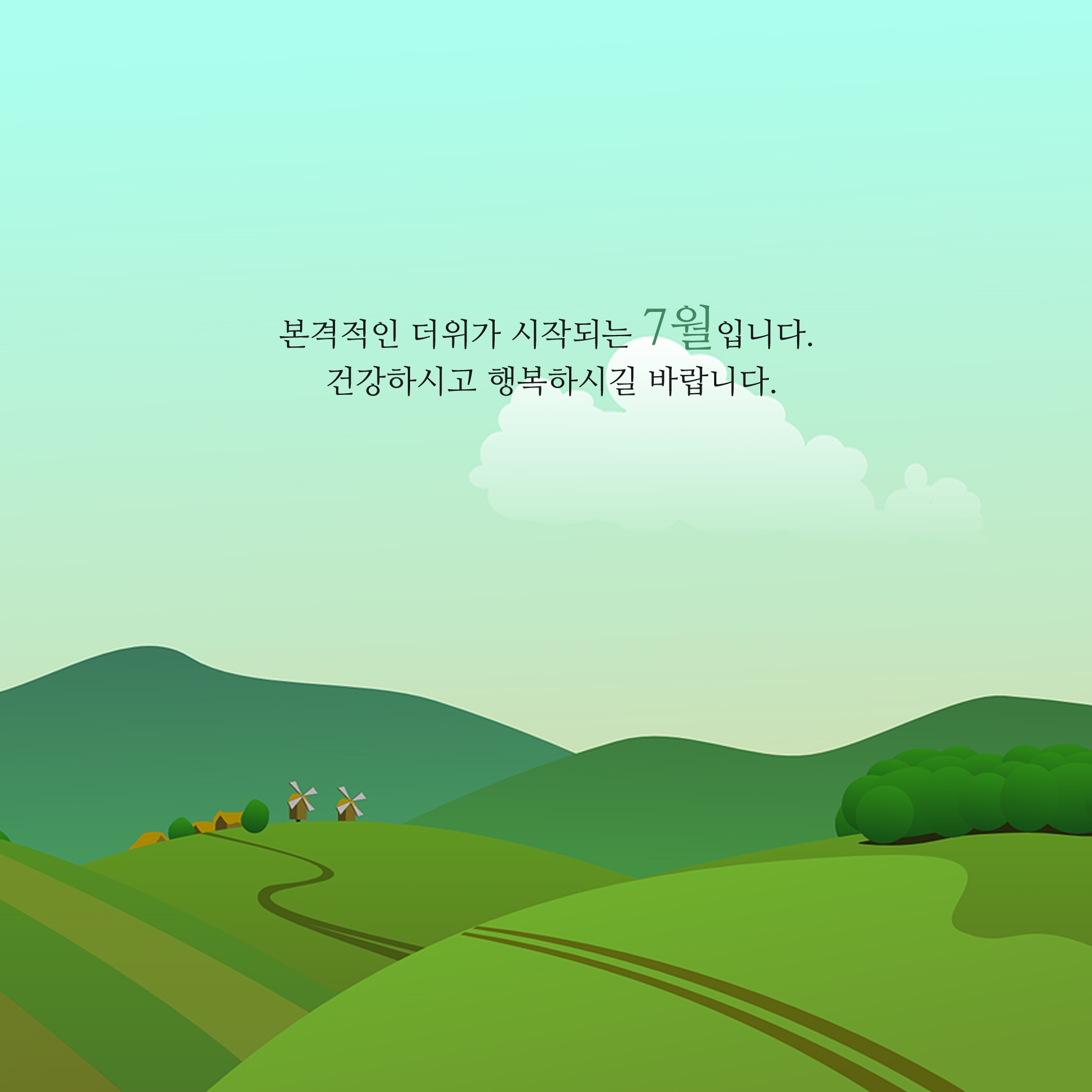 본격적인 더위가 시작되는 7월입니다. 더운 날씨 탓에 몸도 마음도 쉽게 지칠 수 있으니 휴식을 갖고 여유로운 마음으로 즐겁고 행복한 시간 잘 보내셨으면 합니다. 늘 건강하시길 바랍니다.