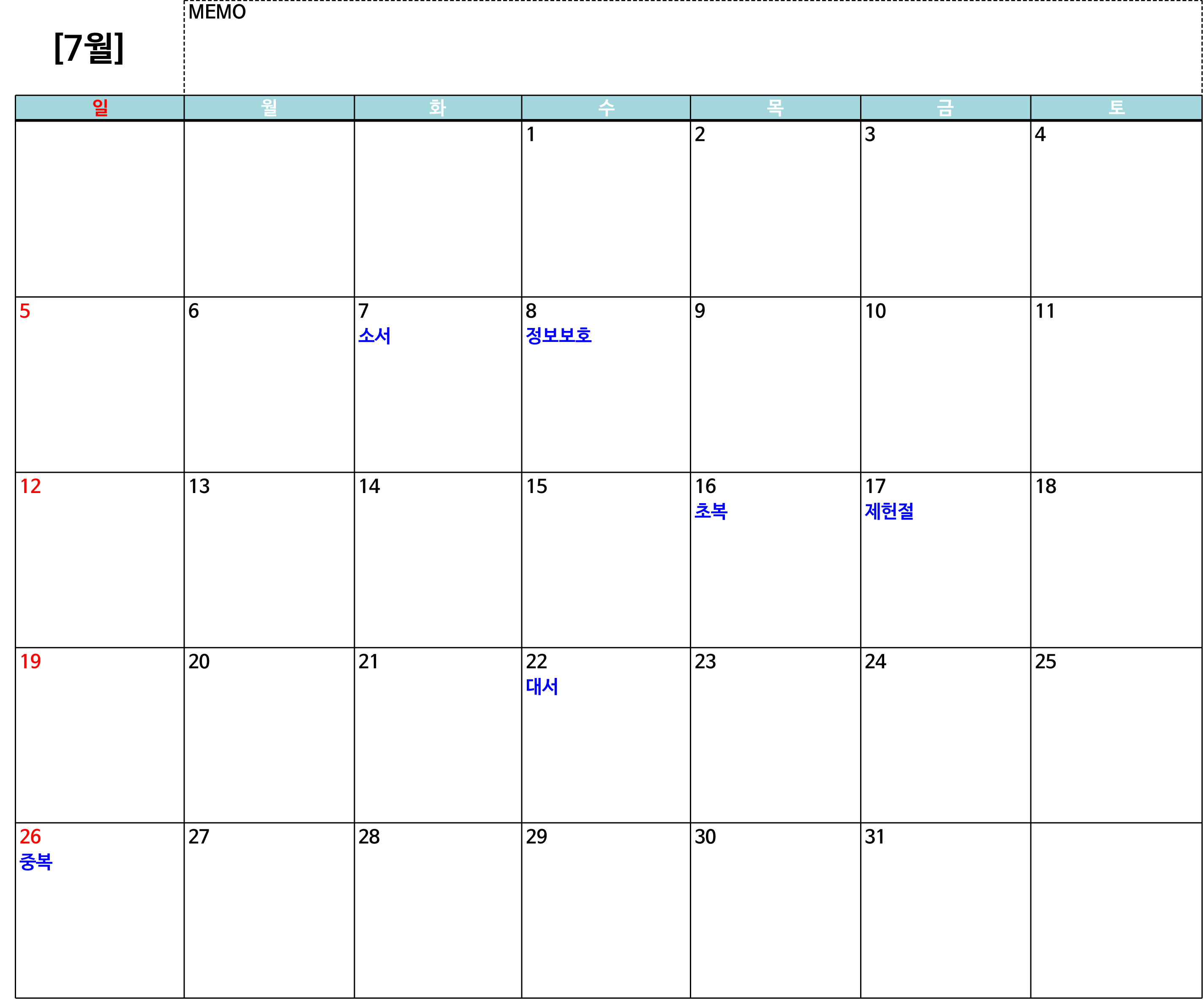 먼저 해당 엑셀파일은 7월 화면인데요. 7월 7일은 7월 16일 초복, 17일은 제헌절이고요. 22일은 대서, 26일은 중복 날로 잡혀 있네요. 이제는 여름의 시작을 알리는 초복과 중복이 포함되어 있어서 영양 만점 영양식으로 몸보신을 하셔서 여름을 대비하시면 좋을 것 같습니다. 위의 이미지 자체를 저장하셔서 다운로드하셔도 되십니다.