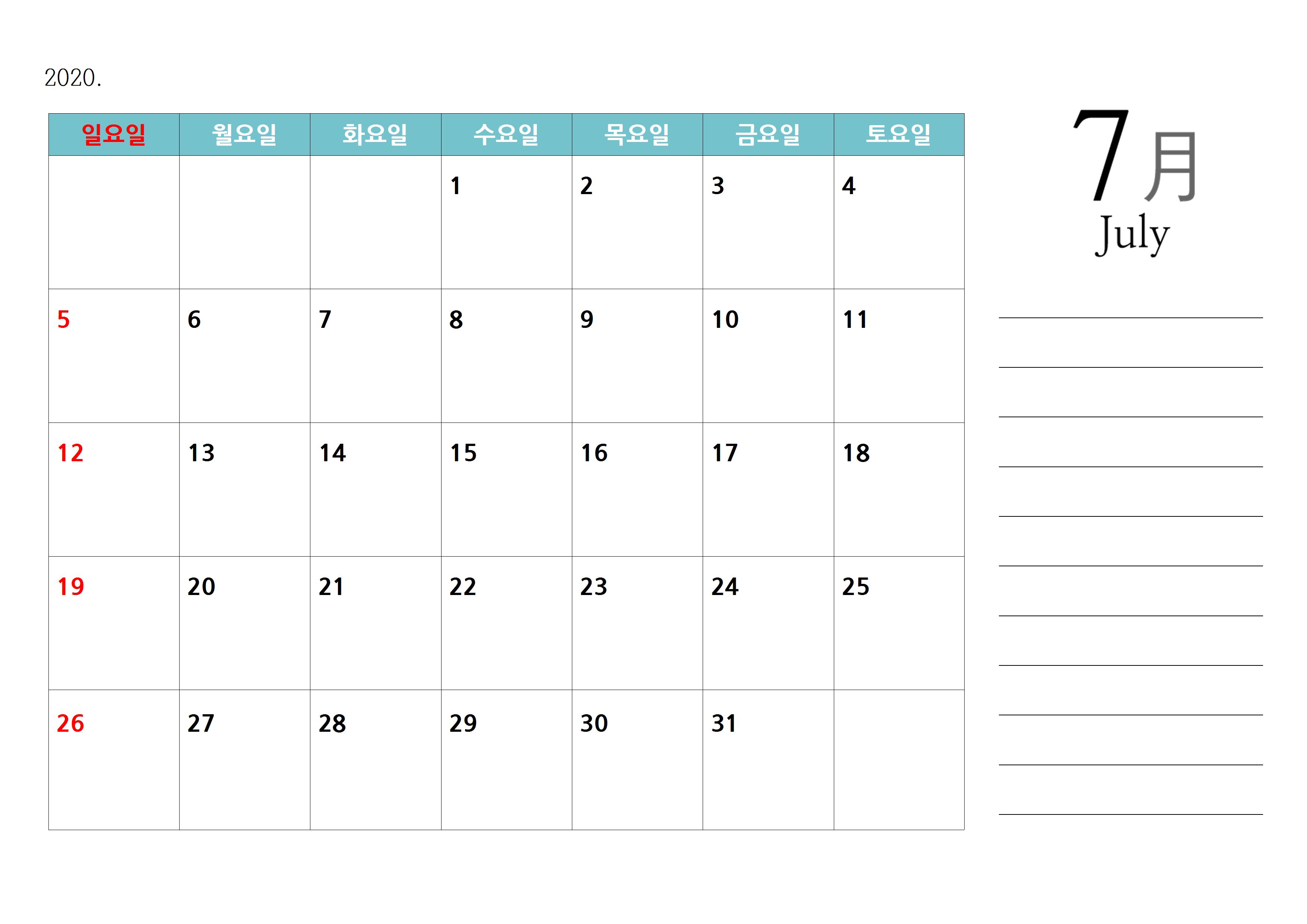 이번에는 2020년 7월 달력 한글 파일입니다. 역시 마찬가지로 두 가지 디자인으로 구성을 해봤습니다. 밝은 민트색으로 예쁜 포인트를 줘봤어요.