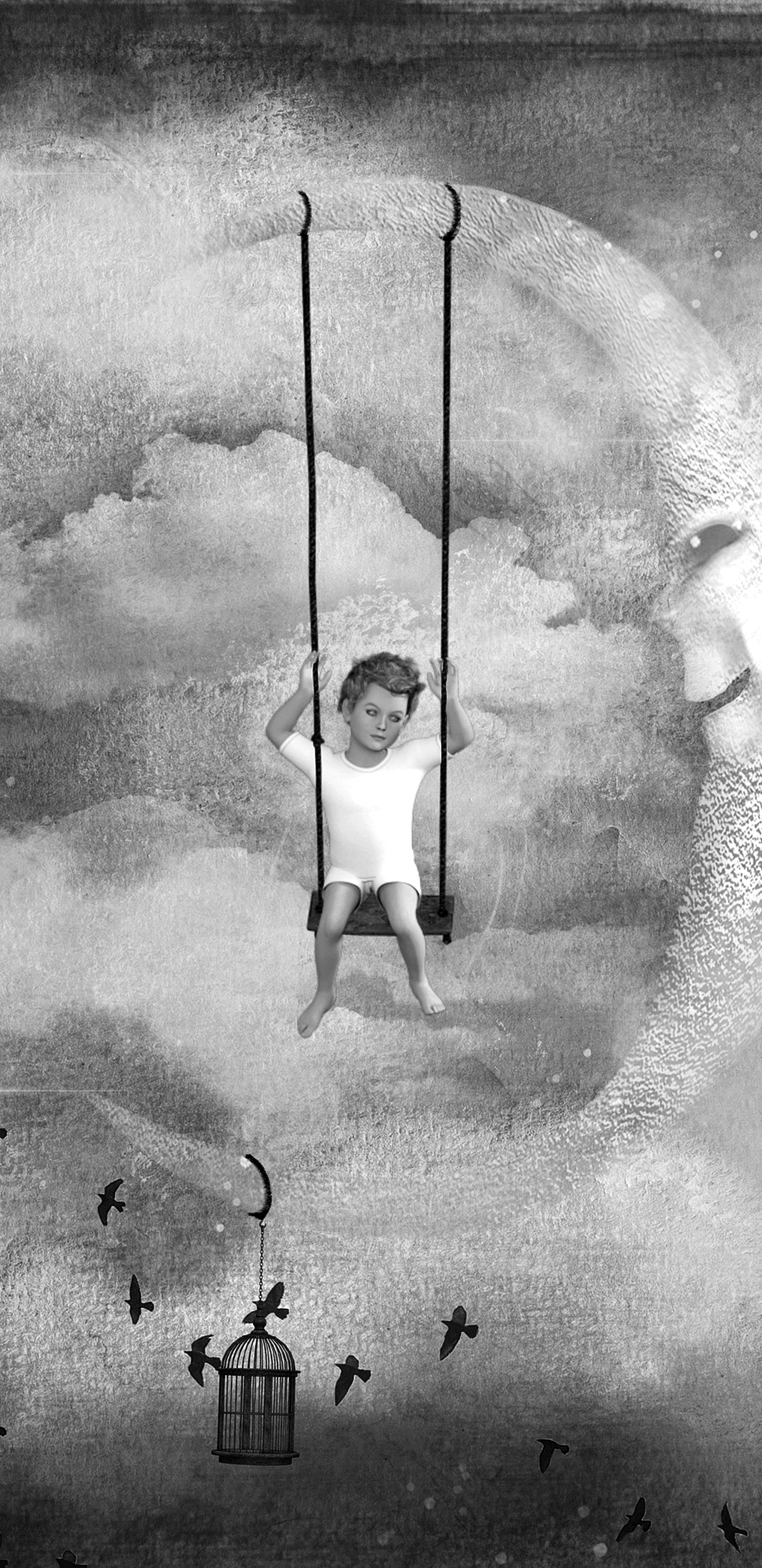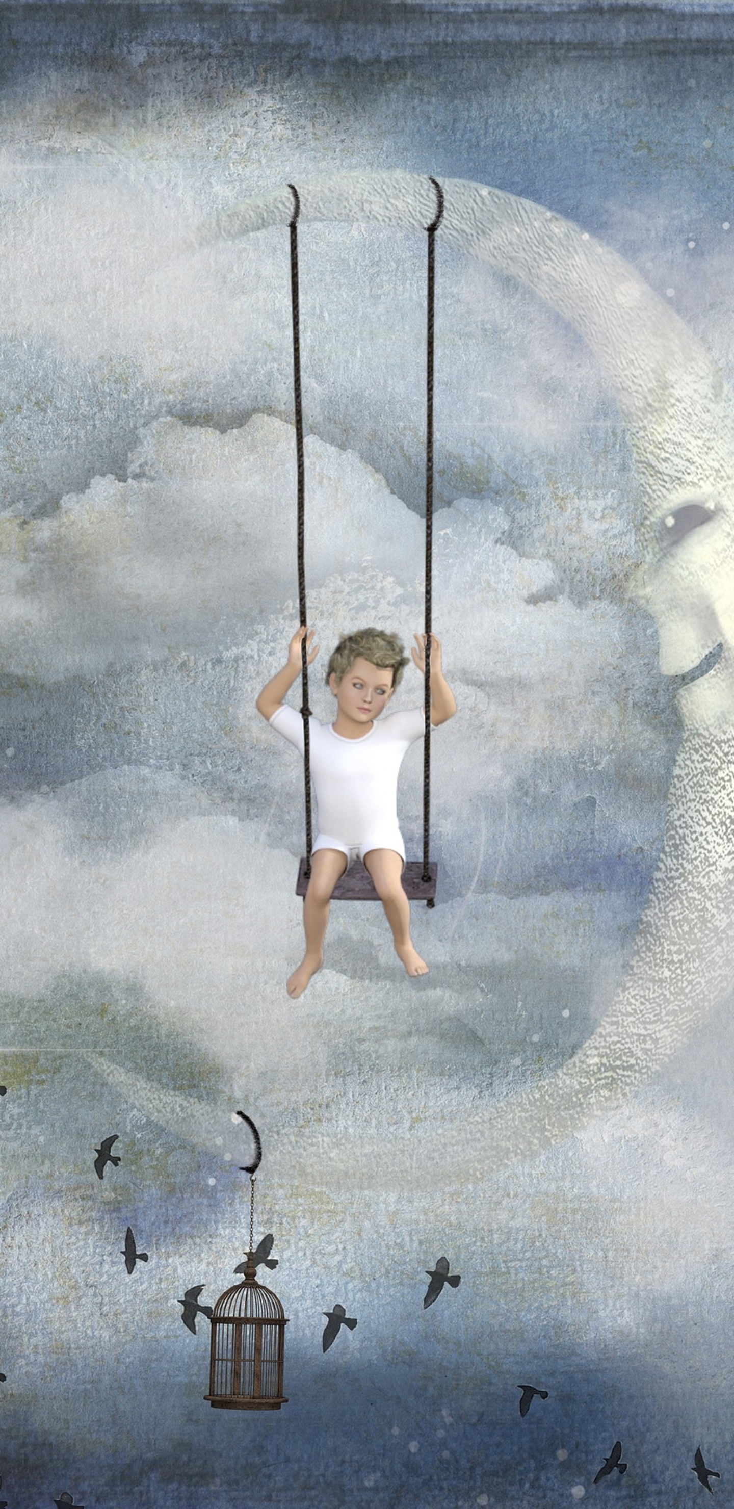 소년이 그네에 매달려 있습니다. 초승달 끝부분에 밧줄로 매달은 그네에 소년이 타고 있으며 그 아래에는 새장도 매달려 있습니다.