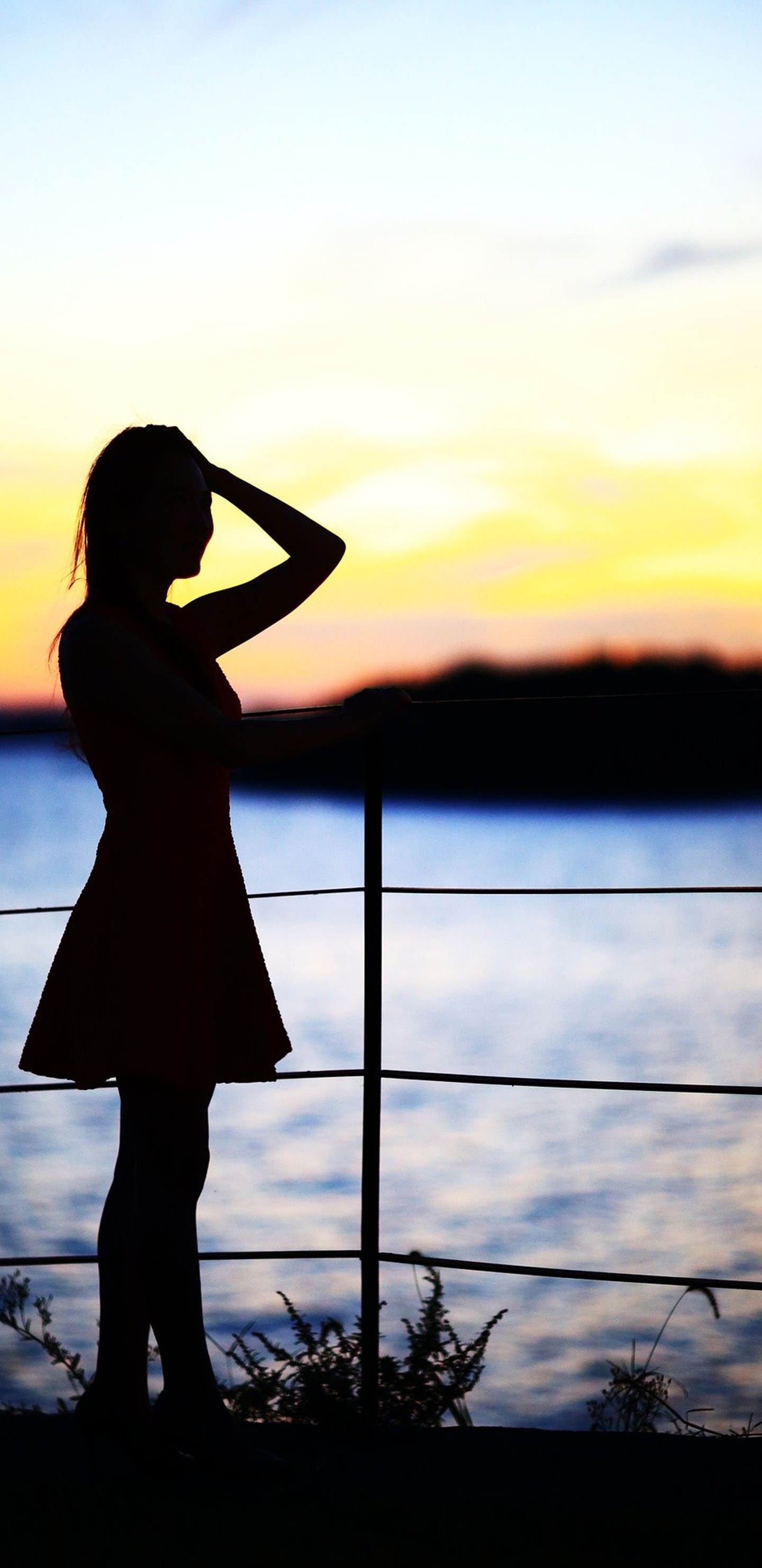 한 여인이 강이 보이는 풍경을 뒤로하고 서 있는 모습입니다.