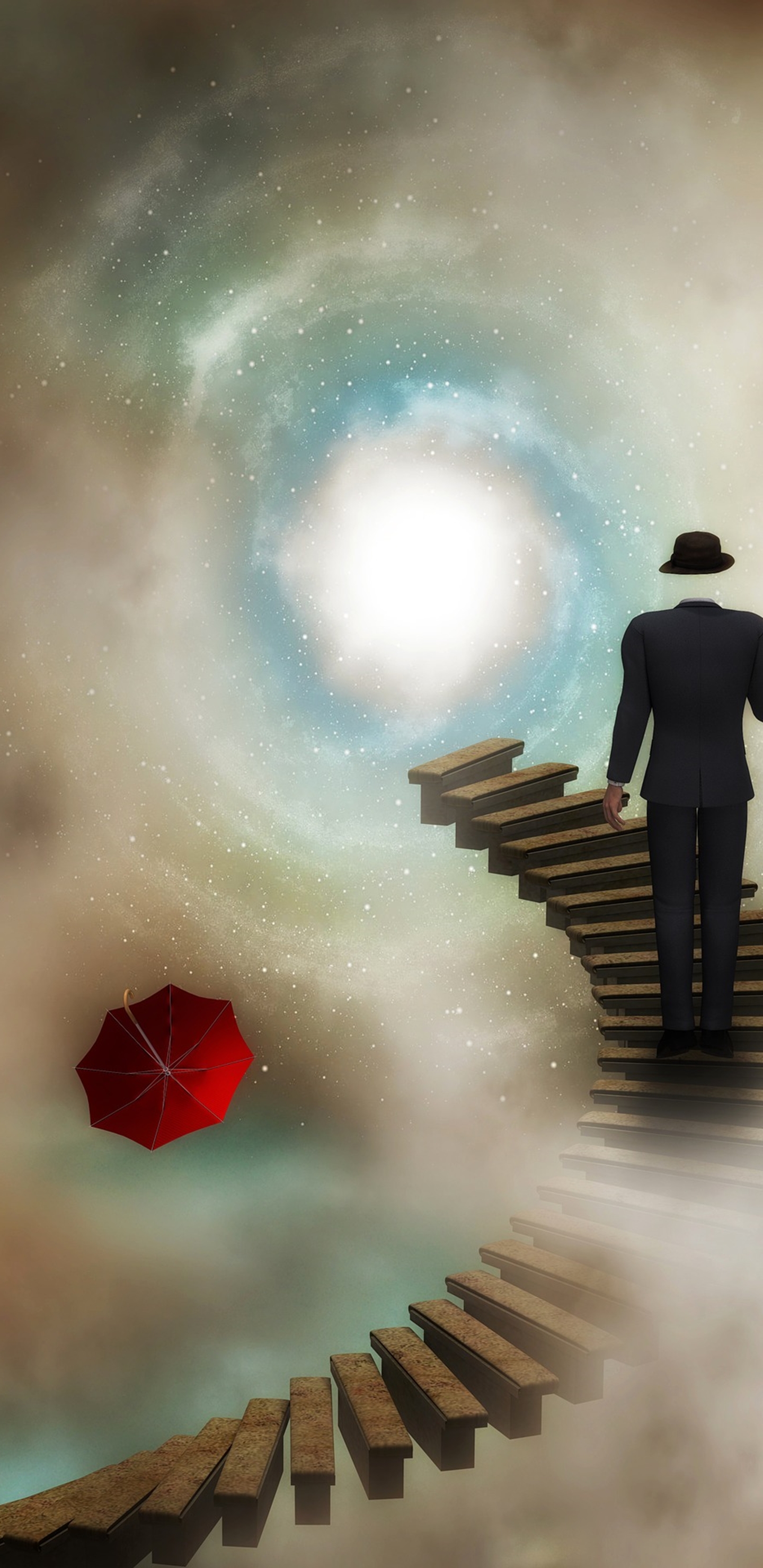 하늘 계단을 걸어가며 올라가고 있는 투명 신사의 모습입니다. 우산은 아래로 떨어지고 있으며 계단의 끝은 밝은 빛을 내고 있네요. 저 끝으로 가면 어디로 가는지 궁금해집니다.