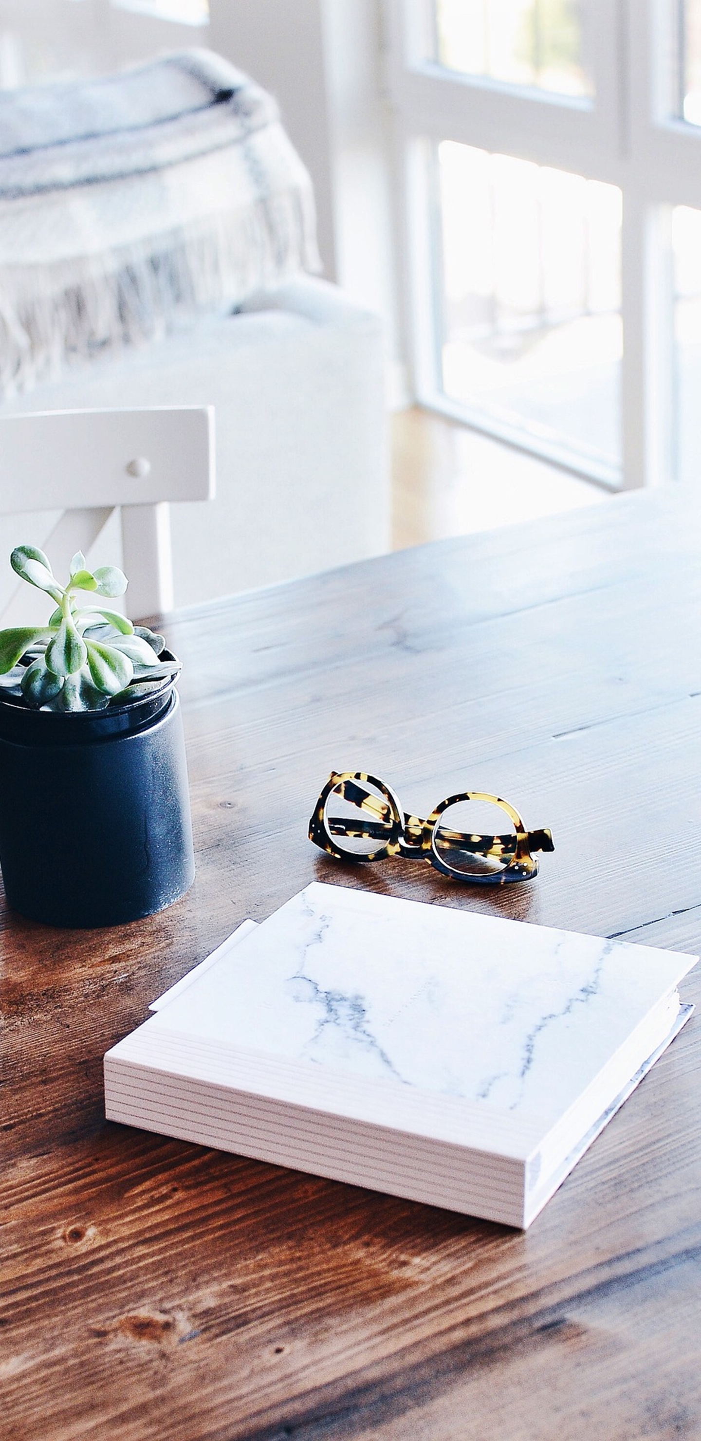 테이블 위에 책과 선글라스 화분이 놓여 있는 사진인데요. 그 뒤로는 화사한 빛이 창밖 너머로 들어오고 있어 아침의 감성을 전해줍니다.