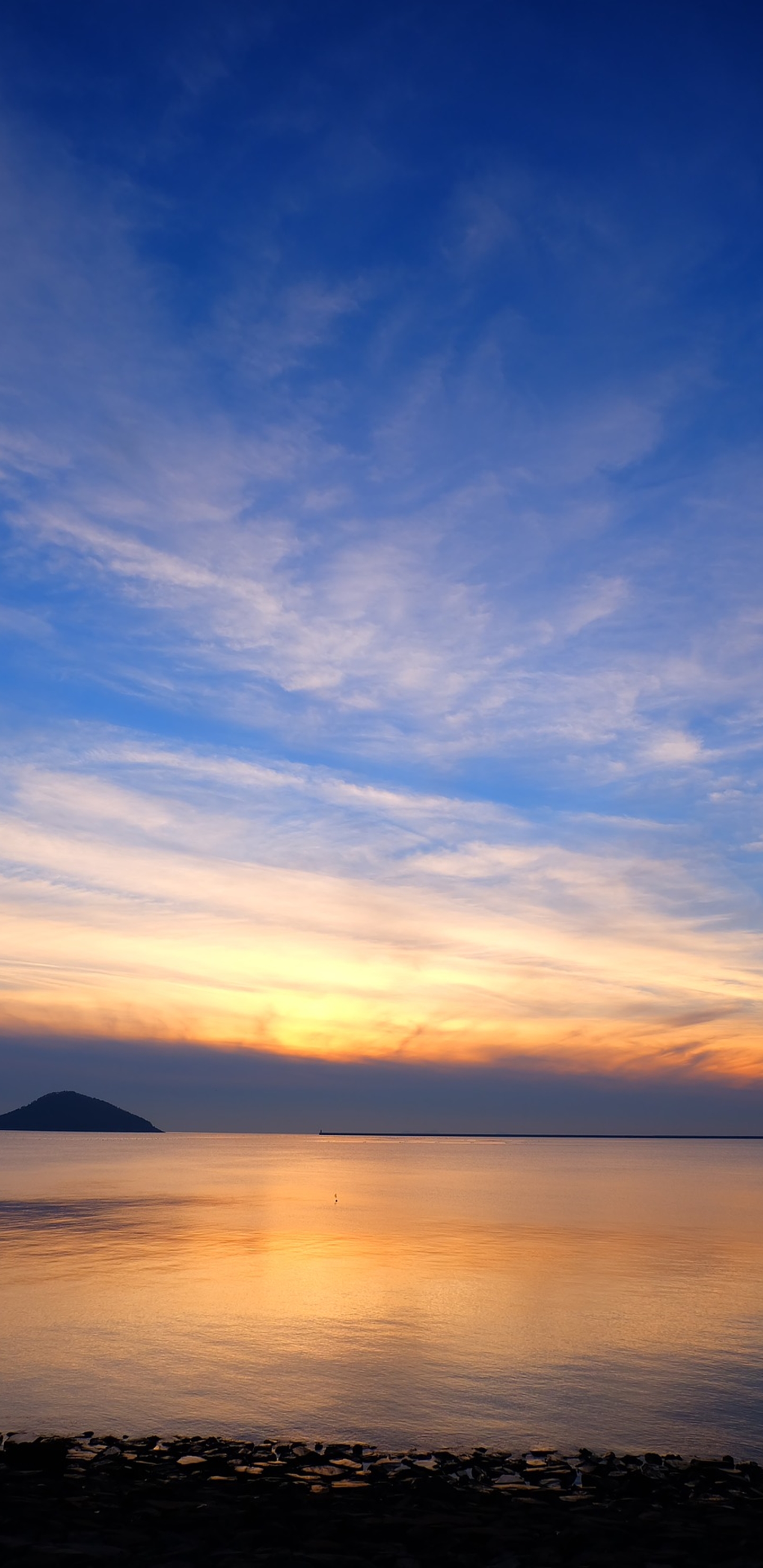 고요한 바닷가 근처에 노을이 예쁘게 지고 있습니다. 바닷물도 파도 없이 잔잔하게 흐르고 있어 평화로운 느낌을 전해줍니다.