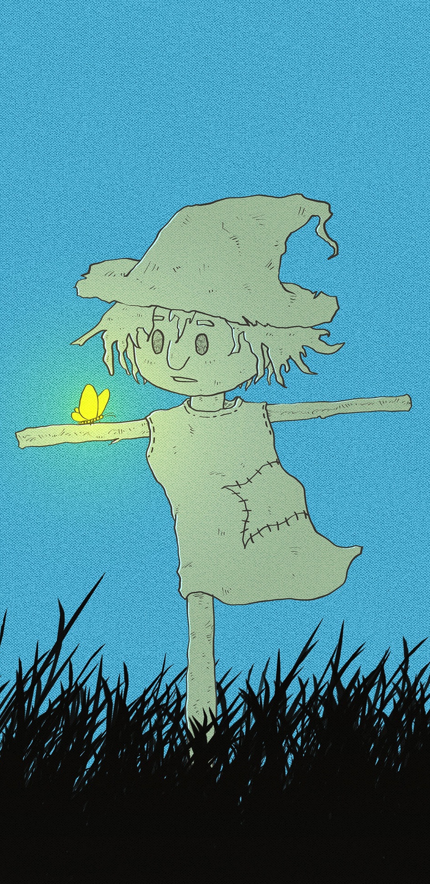 하루 종일 아무것도 안 하고 서 있는 허수아비가 뜻밖의 친구를 만나고 있어 당황하고 있는 듯한 표정입니다. 밝은 빛을 내고 있는 노란 나비가 허수아비 팔 위에 우연히 앉아있는 것 같네요.