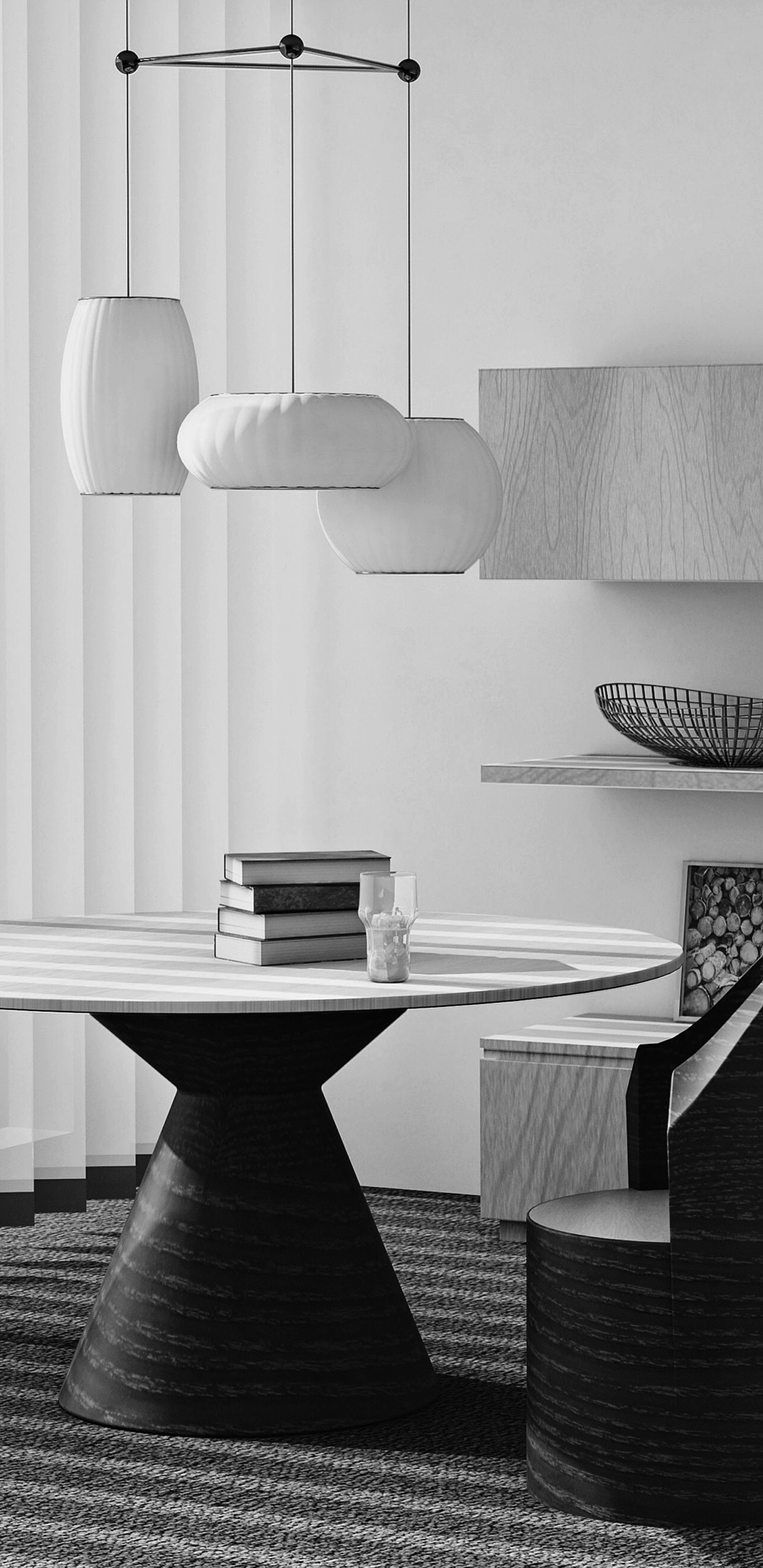 목재형 가구들이 배치되어 있는 분위기 있는 인테리어를 배경으로 하고 있는 사진입니다. 감각적인 모양의 테이블과 의자 그리고 그 테이블 위에는 책과 음료수 잔이 놓여 있으며, 상단에는 예쁜 인테리어 등이 매달려 있습니다.