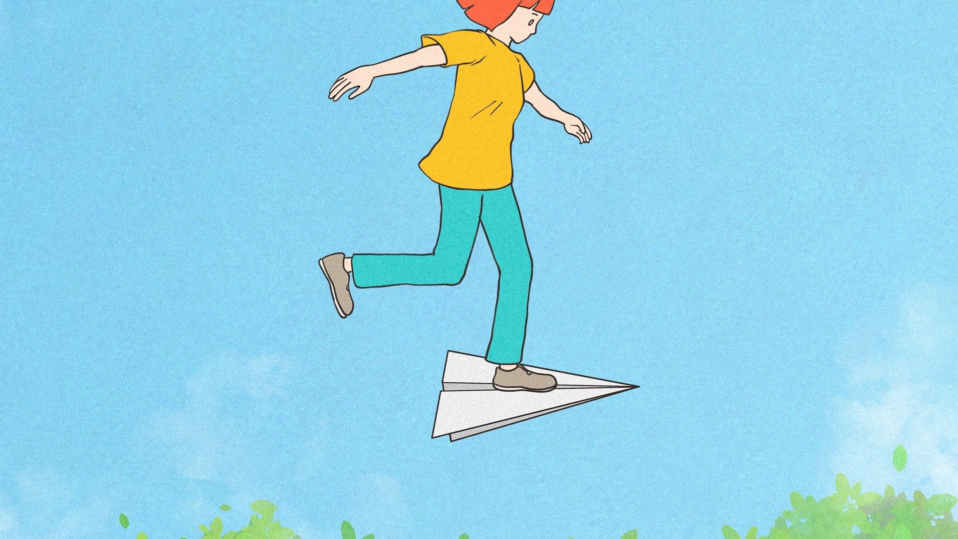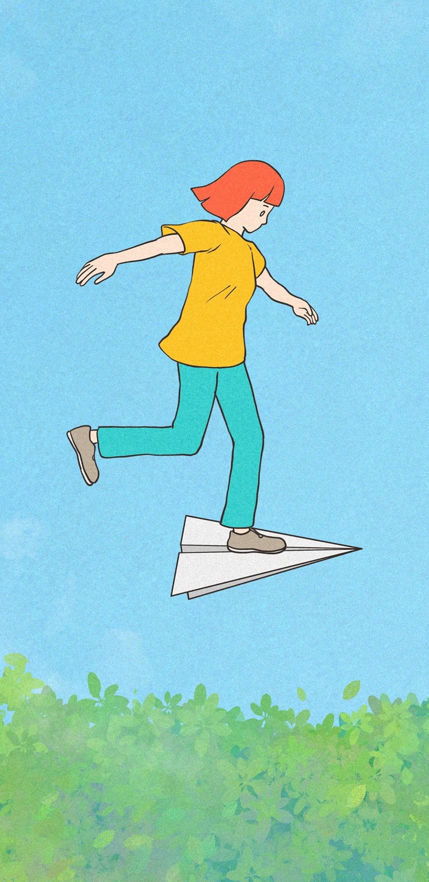 소녀 감성이란 이런 것이 아닐까 싶어요. 현실성은 다소 떨어질지 몰라도 우리가 영화나 동화 소설을 보는 것처럼 이 날아가는 종이비행기 위에 탄 소녀의 모습도 우리의 감성을 자극합니다. 풀이 우거진 위 푸른 하늘 노란 반팔 티셔츠를 입고 있는 주황색 머리를 하고 있는 소녀가 날아가고 있는 종이비행기 위에서 중심을 잡고 있는 모습이고요.