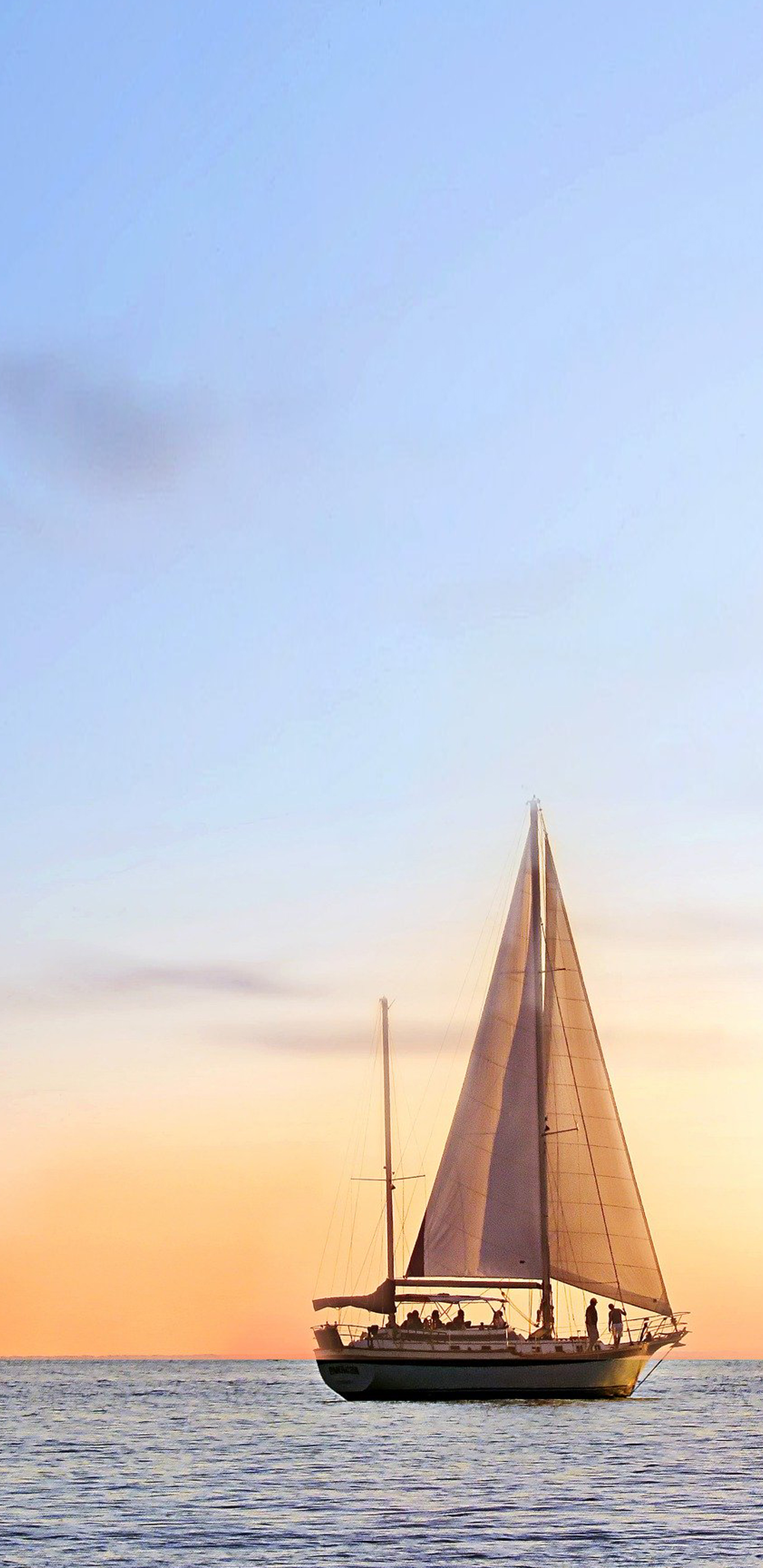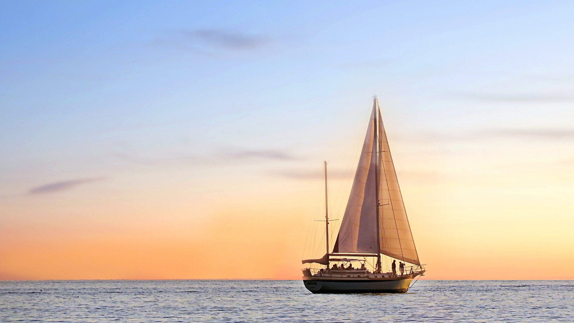 깔끔한 화질로 나온 바다 위에 떠 있는 요트같이 생긴 소형 배의 모습입니다. 안에는 관광객들이 타고 있는 것 같으며 그 뒤로는 주황색의 노을빛이 점점 강해지고 있습니다.