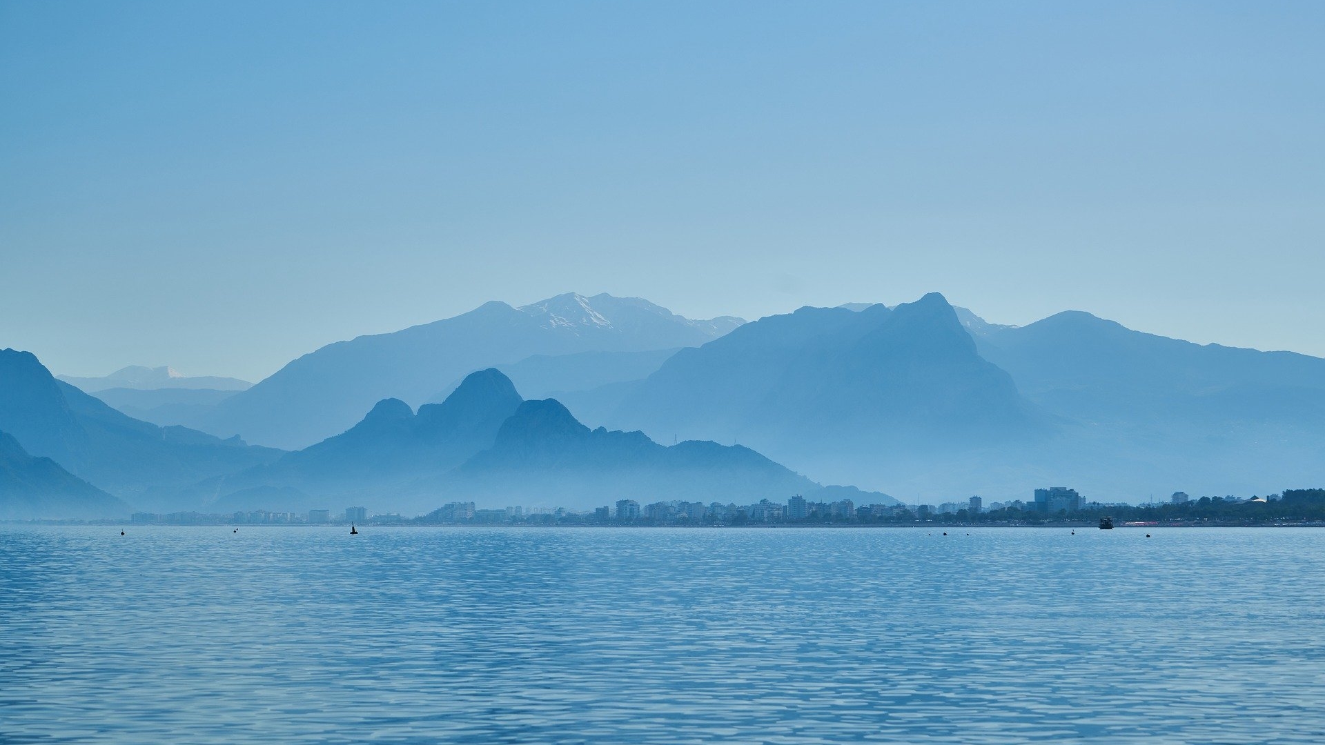 잔잔하게 흐르는 바닷물과 저기 저 멀리 보이는 해안 중소도시 마을이 보이고 그 뒤로는 높은 산들이 우거져 있습니다. 전반적으로 파란색 느낌이 배경을 이루는 풍경이고요. 이런 색들이 시원한 느낌을 전해주지 않을까 싶습니다.