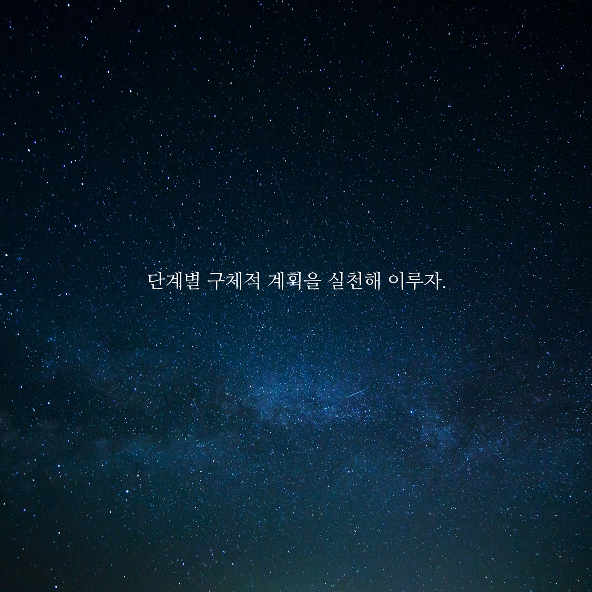 성공은 막연한 것이 아니라 단계별 구체적 계획을 차근차근 이루는 것이 성공이 아닌가 싶습니다. 이번의 계절도 하고자 하는 것이나 목표가 있으시다면 계획을 잘 세우셔서 차근차근 이루어내셨으면 합니다.