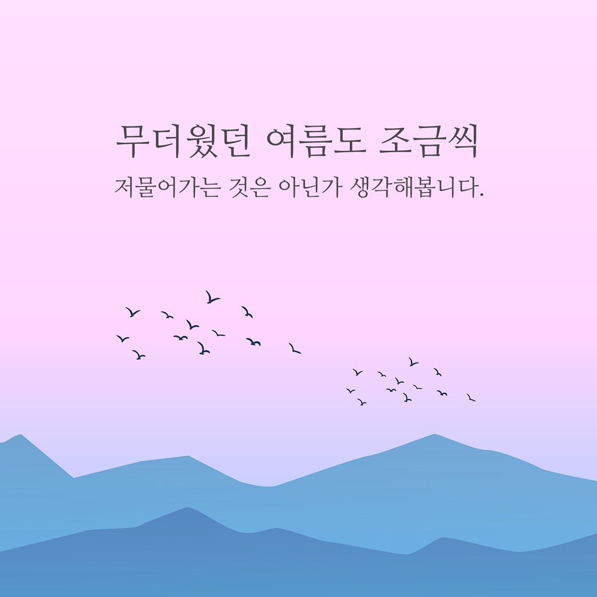 연일 뜨거웠던 더위가 한 풀 꺾인 것 같아 무더웠던 여름도 조금씩 저물어가는 것은 아닌가 생각해봅니다. 8월 말 남은 날도 잘 마무리하시고 항상 즐겁고 행복한 시간 가득하시길 바랍니다.