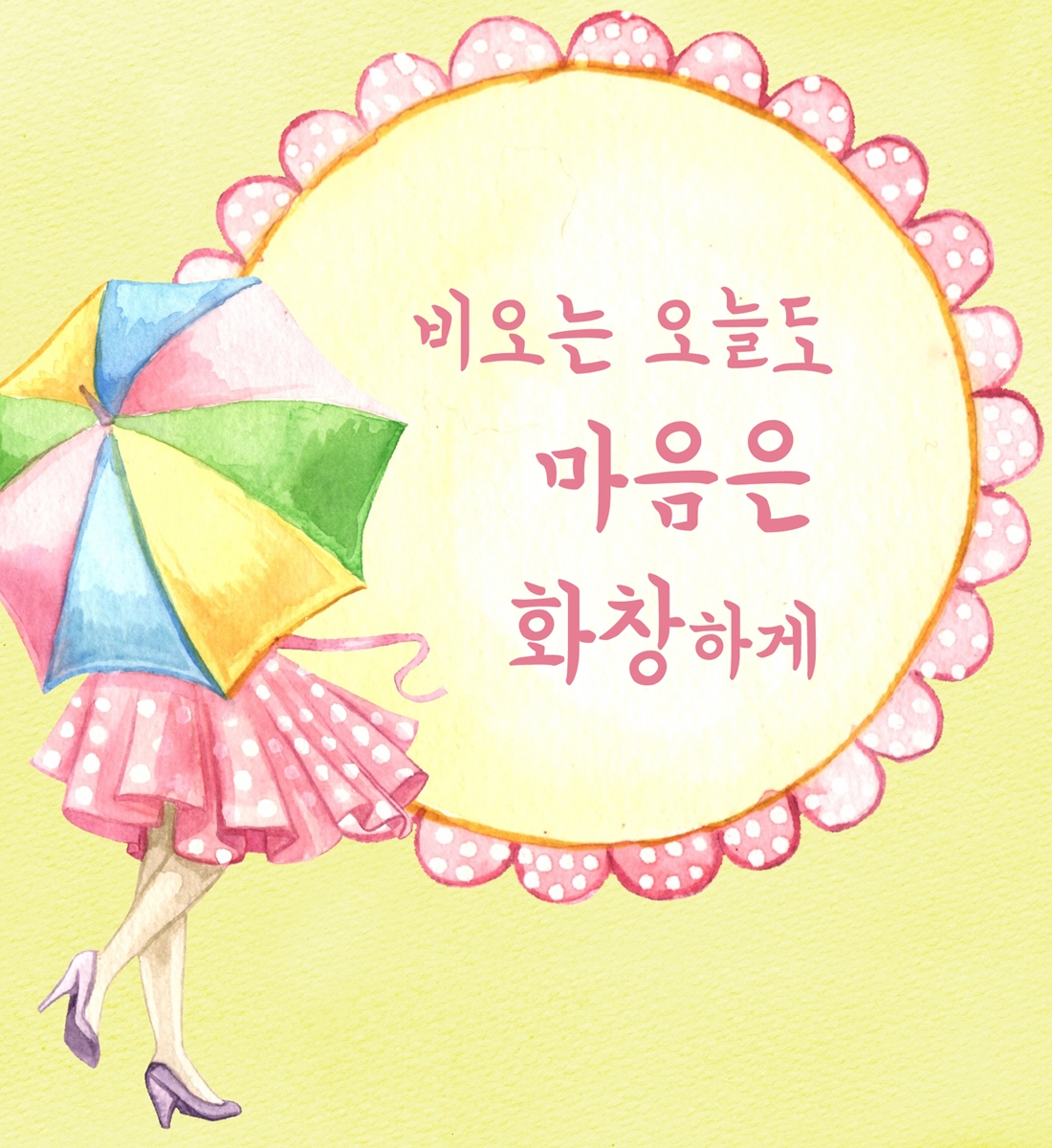 6월/7월 중의 한 중턱에서 본격적인 장마철이 시작되었습니다. 비록 많은 비가 내린 데다가 습기도 높아 기분도 우중충할 수 있지만 먼지가 씻겨내려가는 것처럼 상쾌하고 기분 좋은 마음 잘 유지하셨으면 좋겠습니다. 빗길 안전운전하시고 오늘도 행복한 하루 보내셨으면 합니다.
