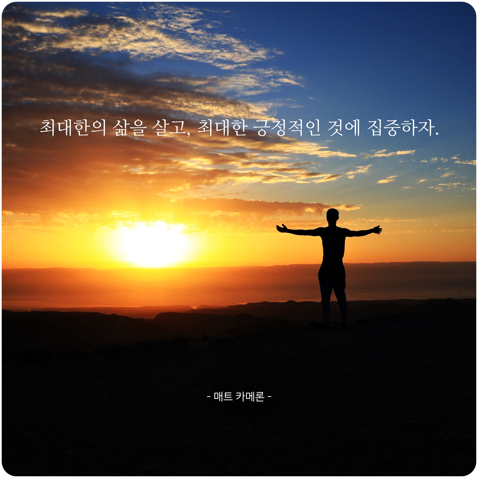 최대한의 삶을 살아야 하며 최대한의 긍정적인 것에 집중을 해야한다는 그런 메세지인데요. 가장 이상적인 삶을 추구하며 살아가야 하고 그런 모든 과정들에는 긍정적인 생각을 갖어야 한다는 뜻입니다. 때로는 이런 한계명언 또는 자기개발에 발전이 될 수 있는 메세지들이 지금 현재에 지쳐있는 저에게 다시 한 번 귀감이 되며 마음속으로 받아들일 수 있는 그런 메세지란 생각이 듭니다. 여러분들에게도 올바른 가치관을 성립해나갈 수 있는데 도움이 될 수 있었던 시간이 되셨으면 좋겠네요^^