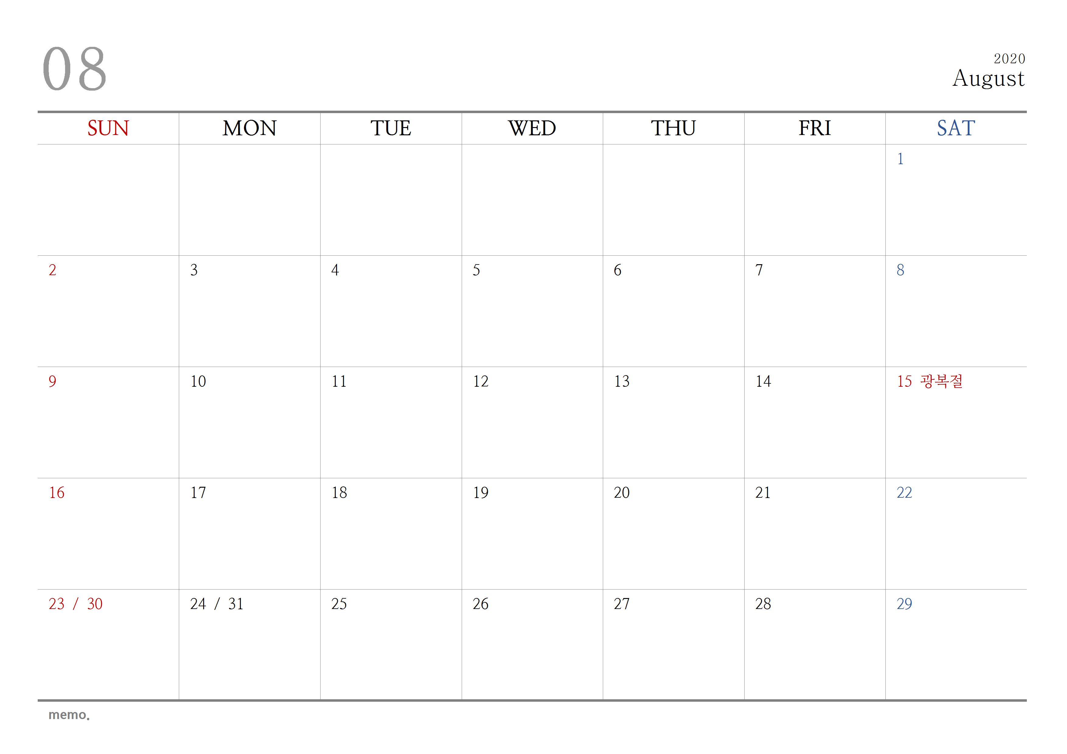 우선 2020년 8월 달력 달력 프린트입니다. 전반적으로 무난하면서도 깔끔한 디자인으로 되어 있으며, 달력에 특정한 색상이 없기 때문에 업무용에 적합하지 않을까 생각이 듭니다.