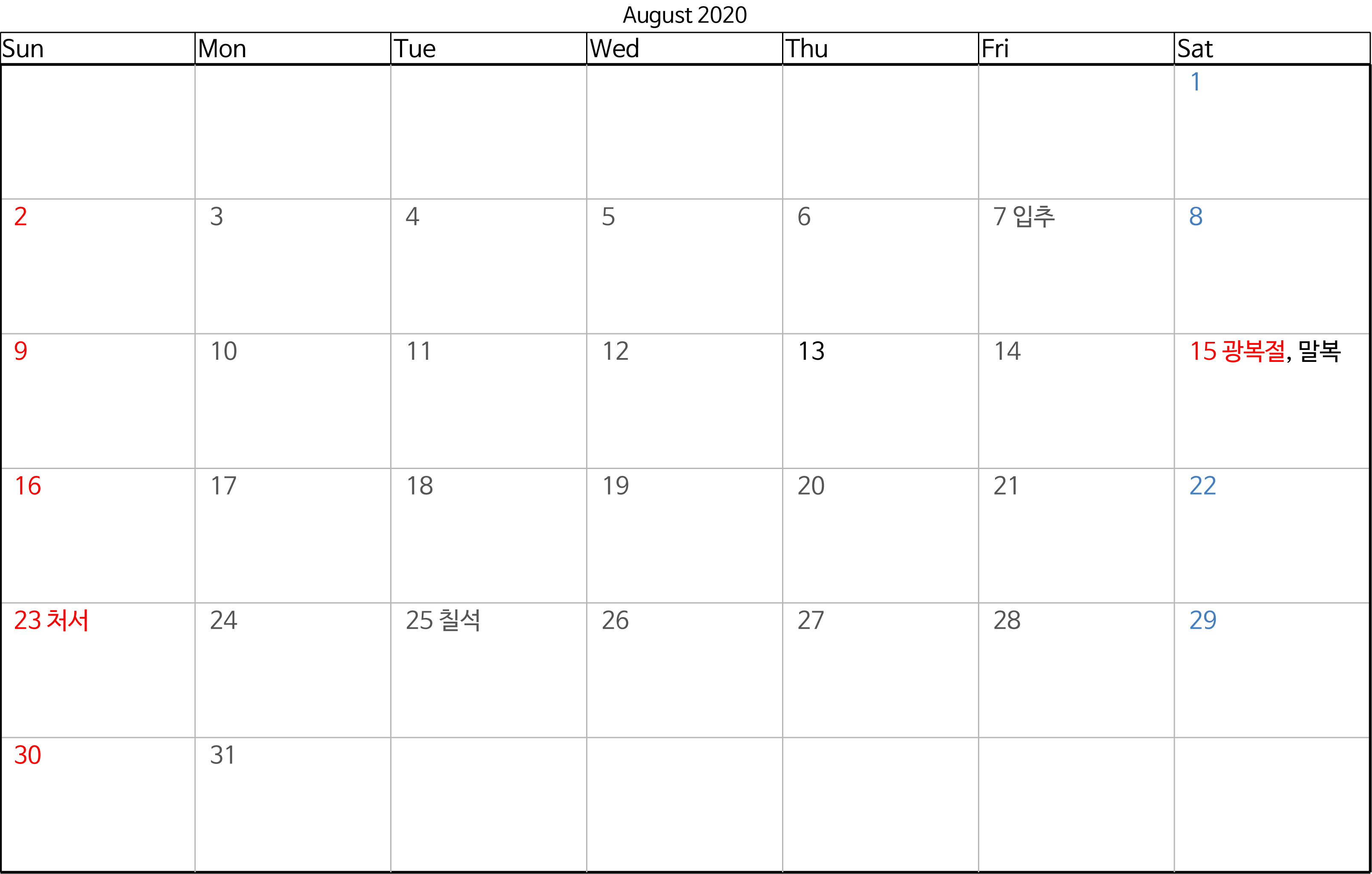 우선 위에 요일 부분을 파란색으로 표기한 2020년 8월 달력입니다. 마찬가지로 이미지만 먼저 나열을 하였으며 디자인 같은 경우에는 빨간 날과 같은 휴일은 빨간색으로 그리고 나머지 기념일이나 행사 일은 파란색으로 표기하여 전형적인 형식에 부합하는 달력입니다.