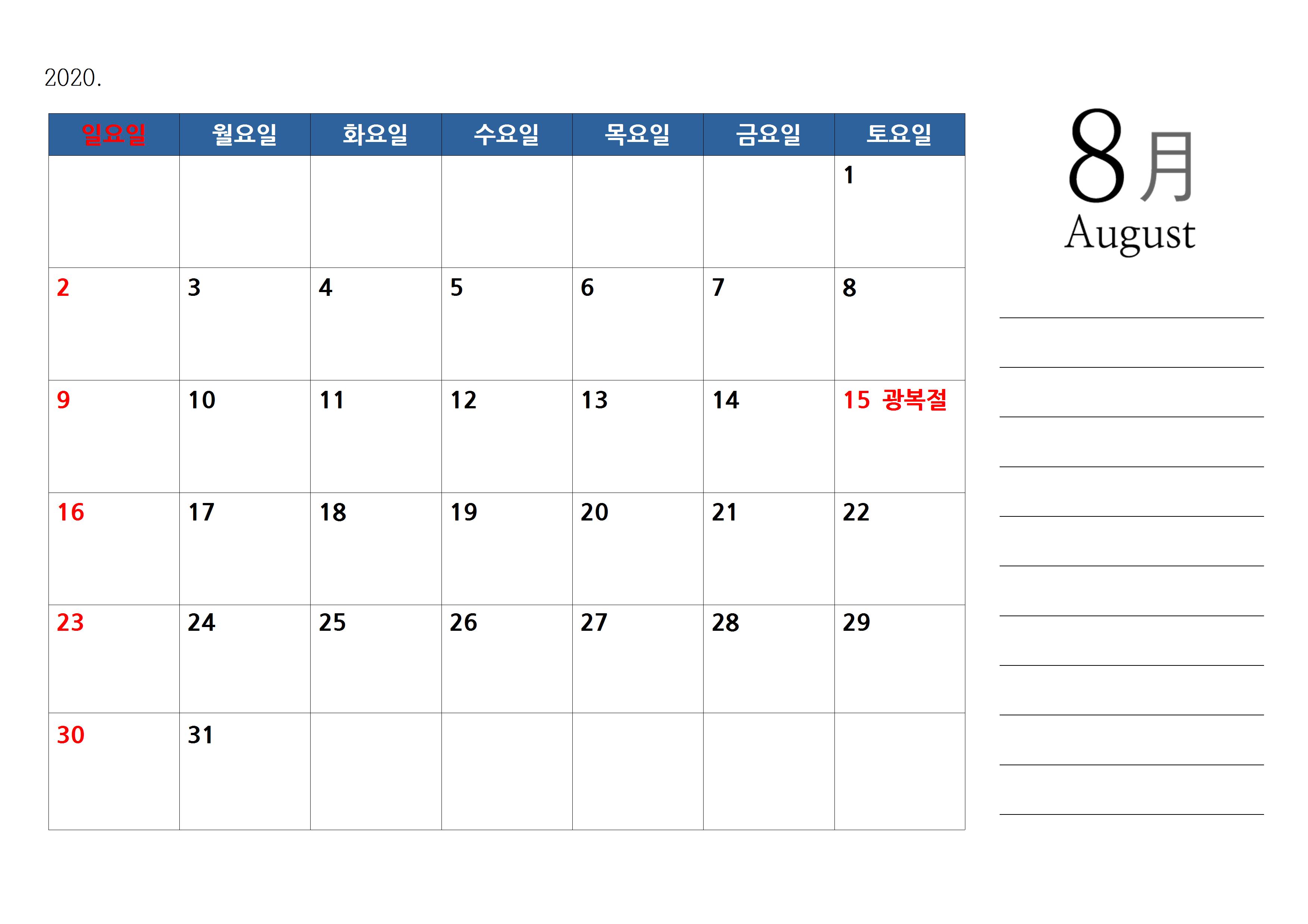 네 번째 디자인은 어김없이 파란색으로 작성, 오른쪽에는 간단하게 메모를 작성할 수 있는 줄이 그려져 있는 2020년 8월 달력 한글 프린트 파일이며, 동일하게 이미지로만 저장 후 출력을 원하시는 경우에는 위에 파일을 다운하시면 됩니다. 날짜는 숫자나 요일 글씨가 잘 보이도록 두껍고 굵게 작성이 된 달력입니다.