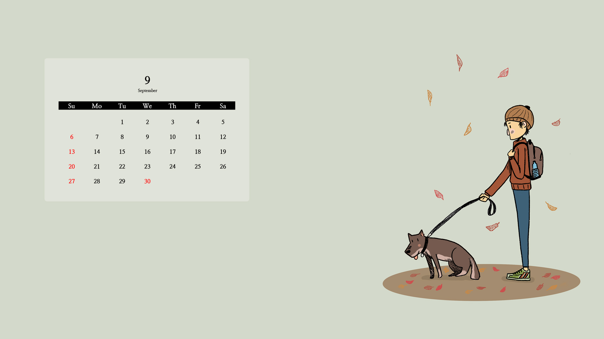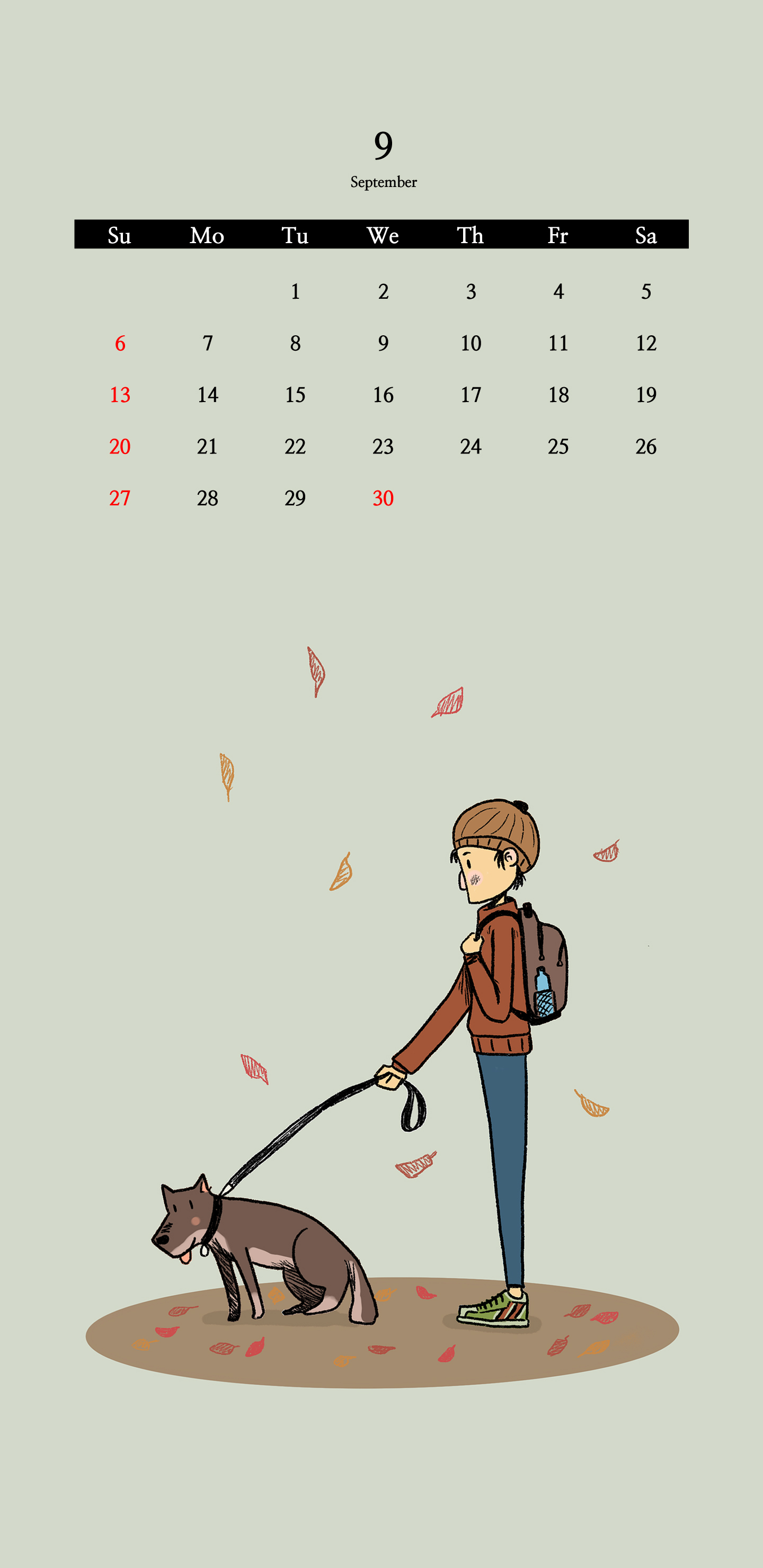 다음 두 장은 일러스트 이미지입니다. 강아지와 함께 외출을 하고 있는 낙엽이 떨어지고 있는 가을 소년의 달력입니다.