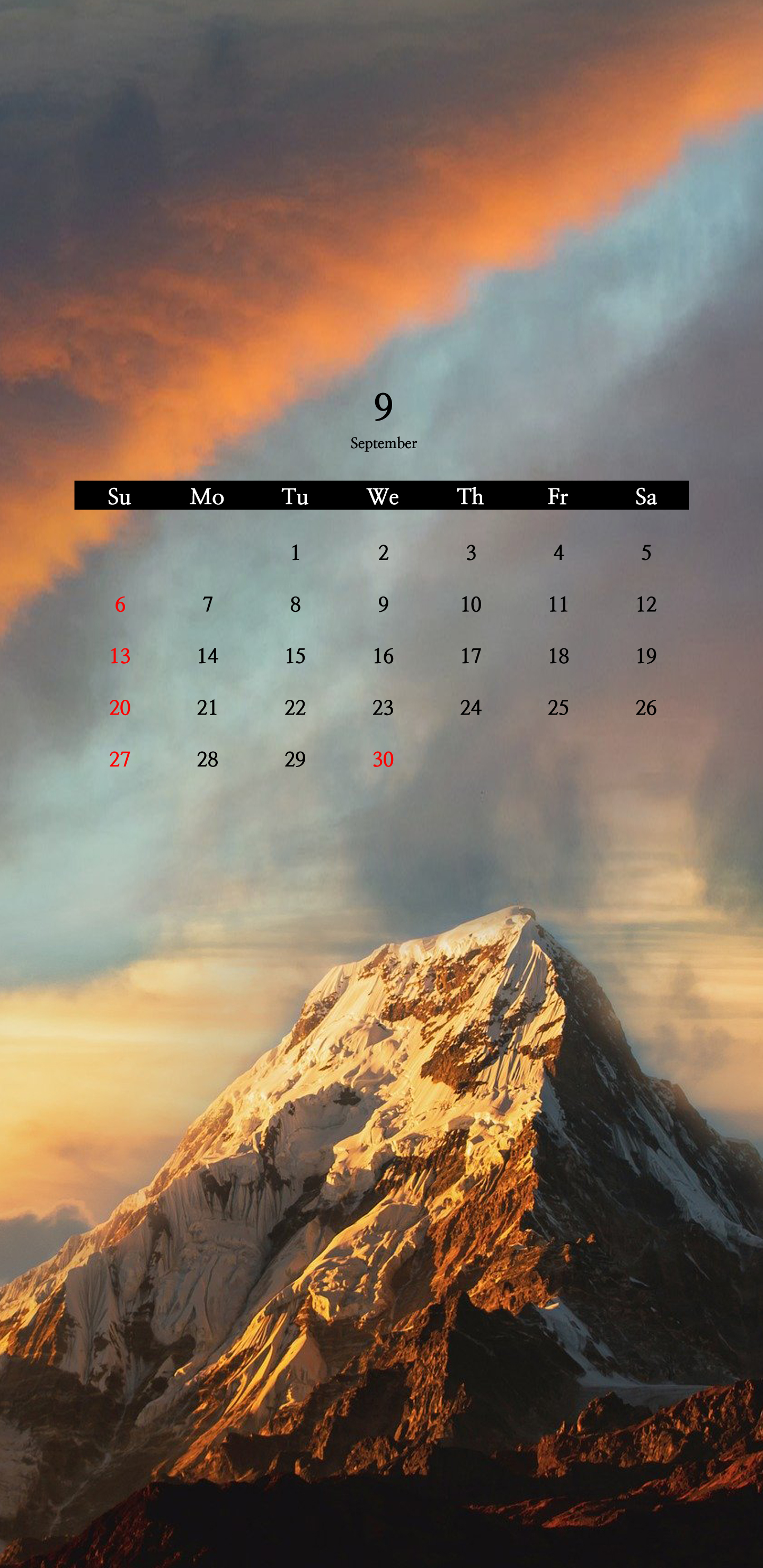 다음은 높은 산맥에 노을을 담고 있는 광활한 자연의 모습을 담고 있는 달력입니다. 구름이 드리워져 있으며 노을 빛깔에 노란 노을빛을 머금은 예쁜 하늘과 가파르게 우뚝 선 산의 모습이 장관을 이룹니다.
