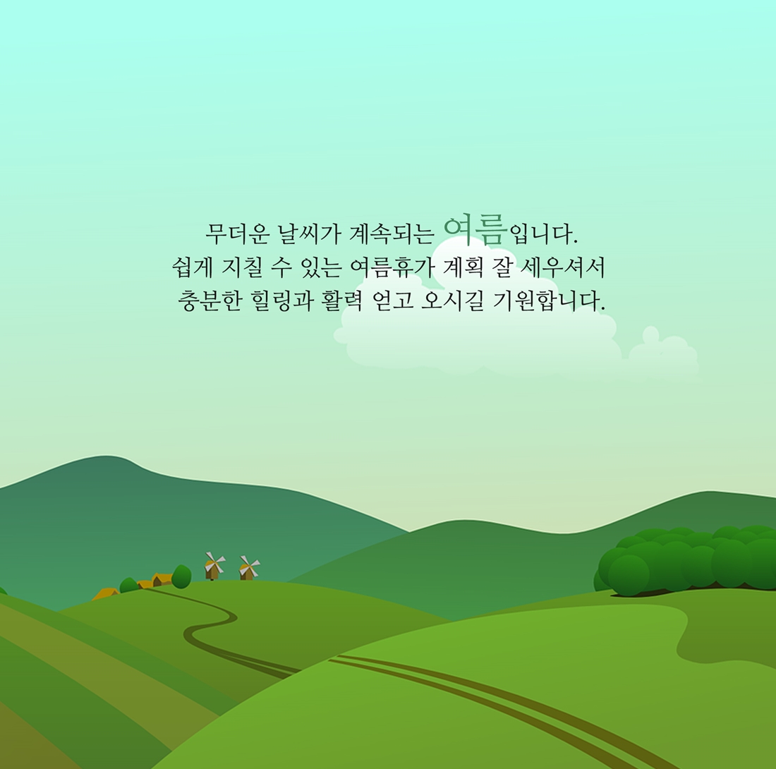 무더운 날씨가 계속되는 여름입니다. 쉽게 지칠 수 있는 여름에도 휴가 계획을 잘 세우셔서 충분한 힐링과 활력을 얻고 오셨으면 합니다. 늘 행복하시고 건강하세요.