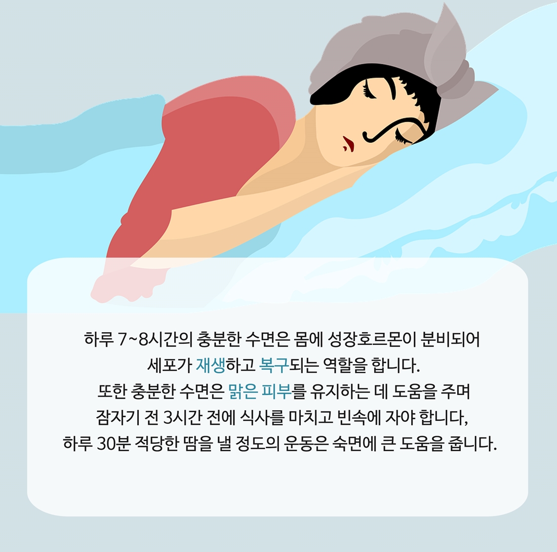 충분한 수면은 우리 몸을 재생하고 맑은 피부를 유지하는 데 도움을 준다고 합니다. 하루 30분 정도 적당한 땀을 낼 정도의 운동은 숙면에 큰 도움을 준다고 하니 뜨거운 낮은 피하시고 저녁 시간 때 가볍게 산책을 하시는 것도 좋을 것 같네요.