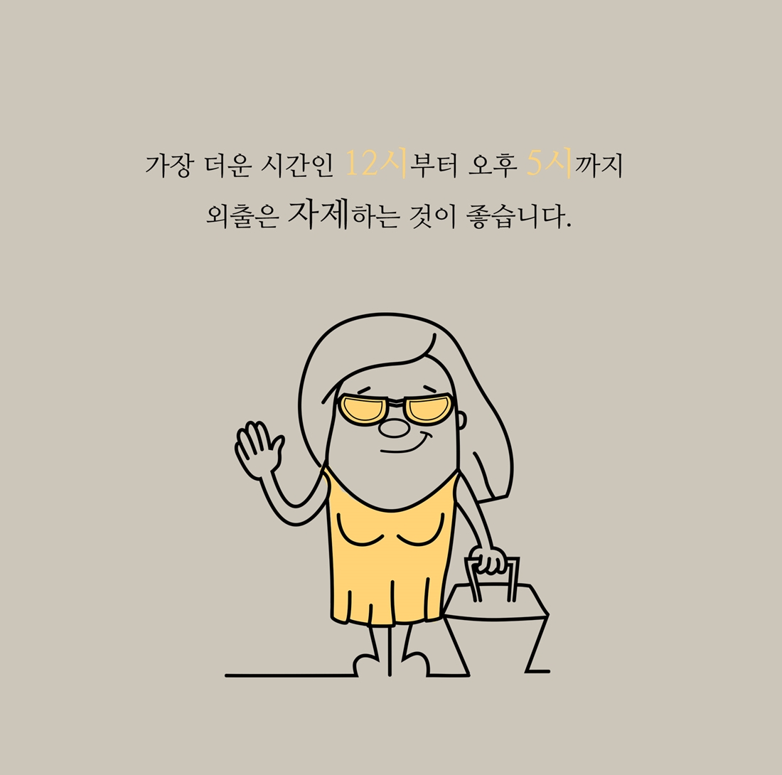 가장 뜨거운 시간인 12시부터 오후 5시까지는 외출은 가급적 자제해 주시고 외출 시에는 선크림을 두껍게 바르셔서 피부 관리에도 각별한 유의를 해주시길 바랍니다.