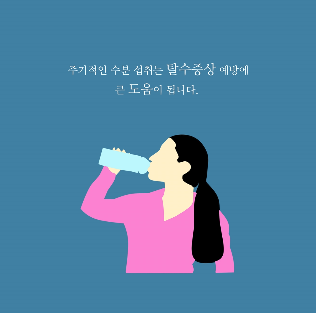 주기적인 수분 섭취는 탈수 예방 증상에 큰 도움이 되므로 주기적으로 충분한 수분 섭취로 건강을 잘 챙기셨으면 합니다.