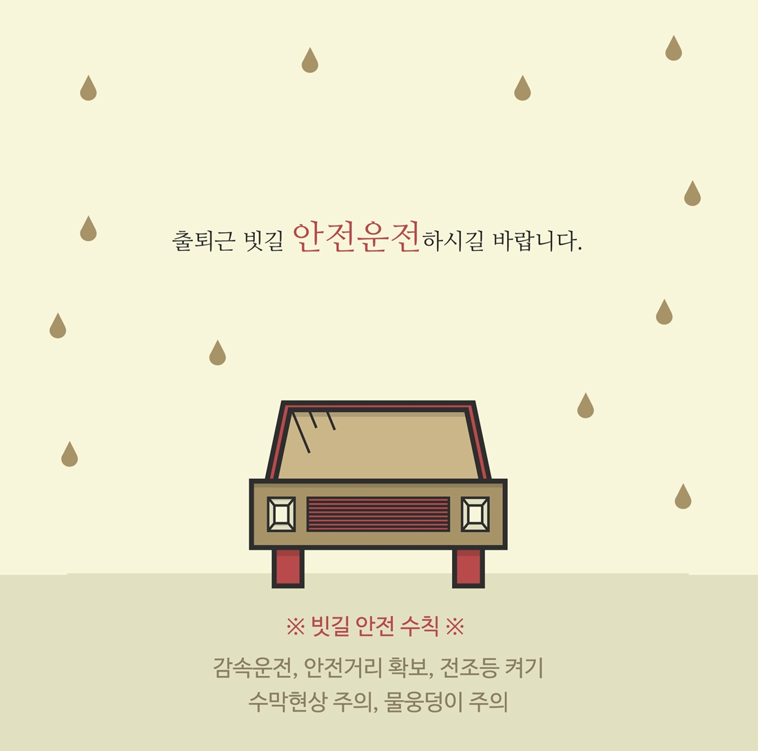 오늘도 전국에 많은 비 소식이 있습니다. 출퇴근이나 외출 시에는 우산을 꼭 챙기시길 바라며 운전 시에는 감속운전, 안전거리 확보, 전조등 켜기를 통해 안전에도 각별한 주의가 필요합니다. 비록 많은 비가 내리더라도 오늘도 기쁨이 가득한 하루 되시길 기원합니다.