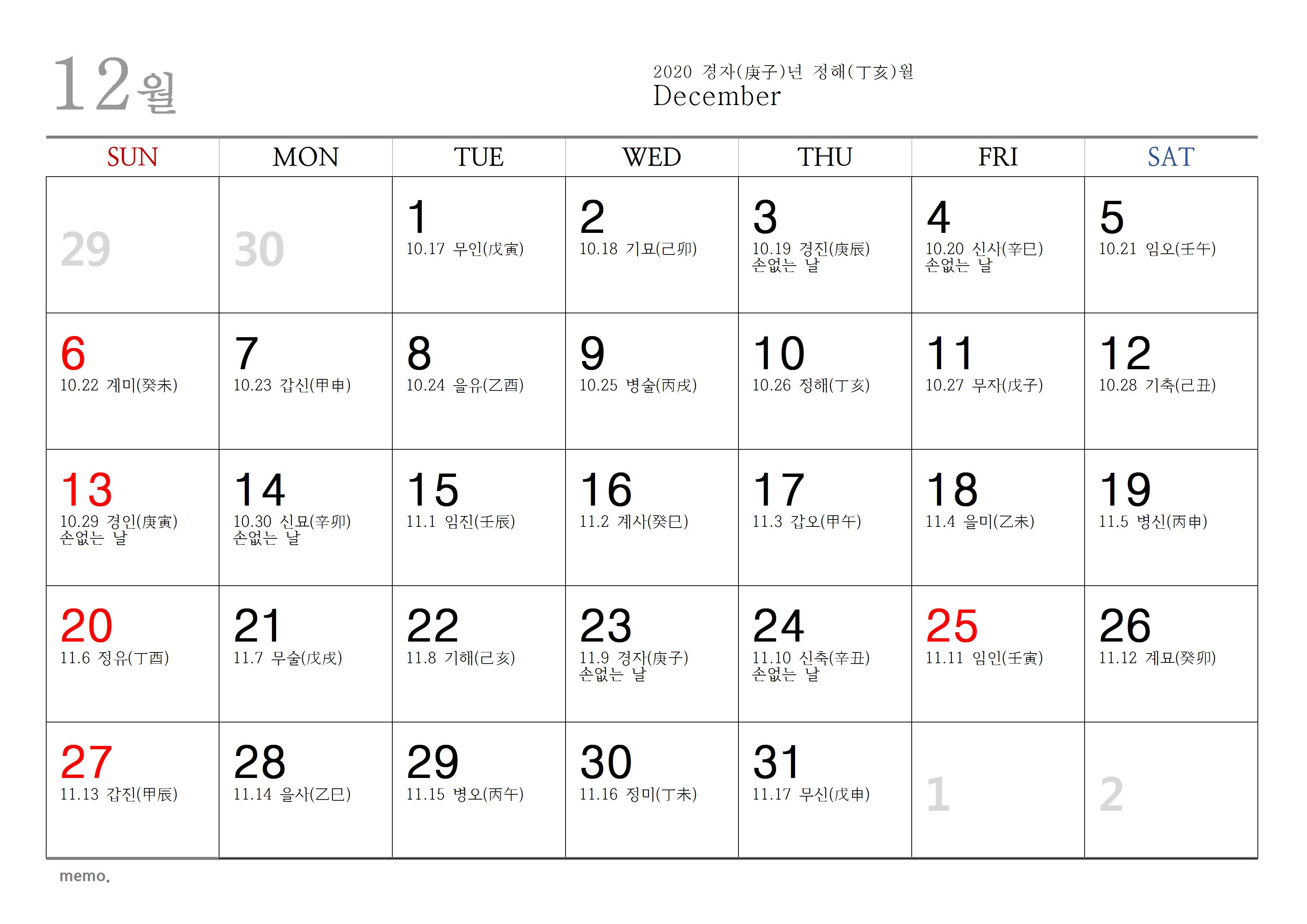 우선 달력은 2020년 1월부터 2020년 12월까지 총 12개의 개월이 들어가 있는 한글 달력이며, 표 안에 양력의 숫자는 제일 큰 숫자로 그리고 그 밑에 작은 글씨로 음력 날짜와 간지 및 손없는 날 등이 표기가 되어있습니다. 윤달같은 경우에는 양력 바로 옆에 '윤'이라고 기재를 했습니다.