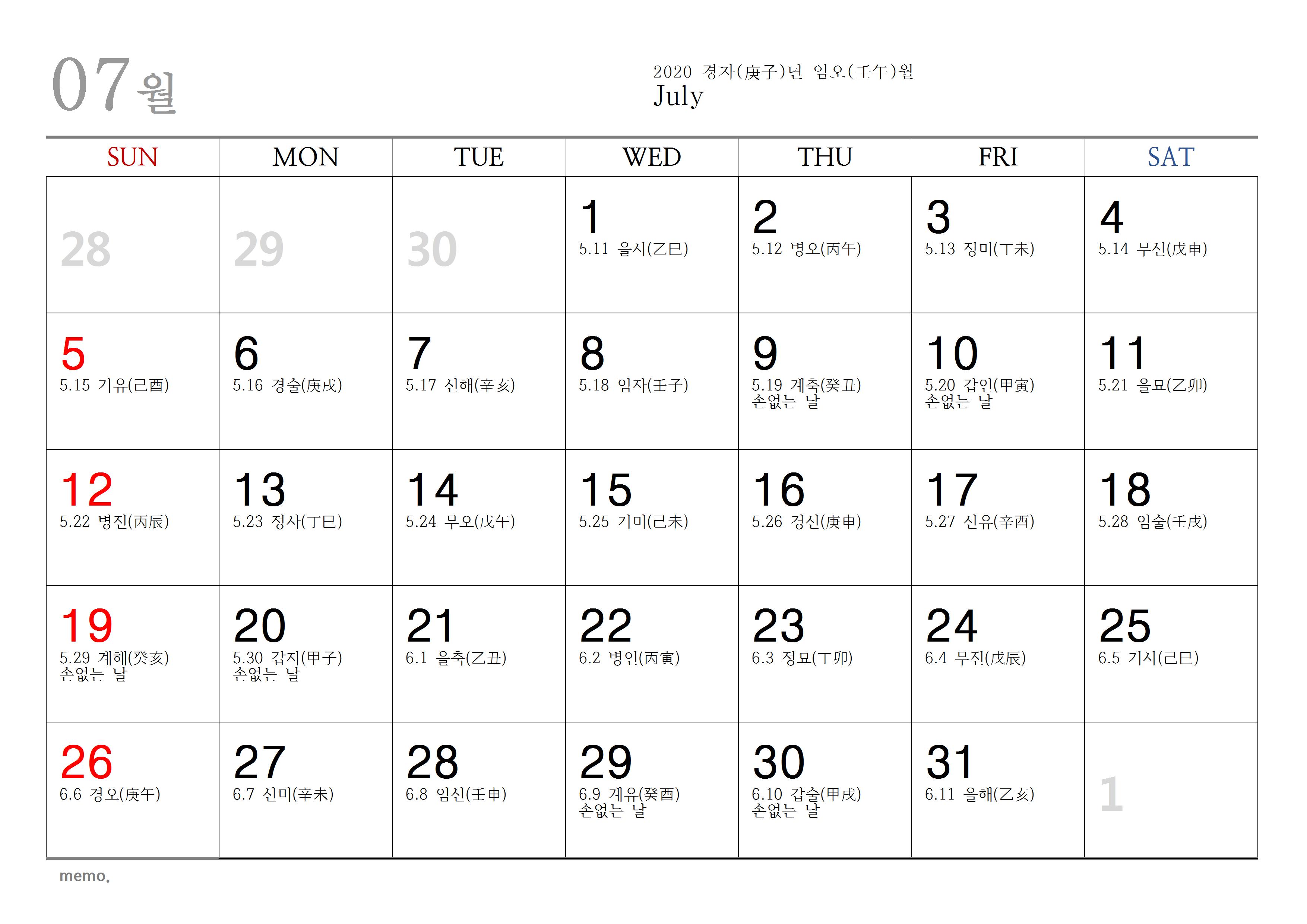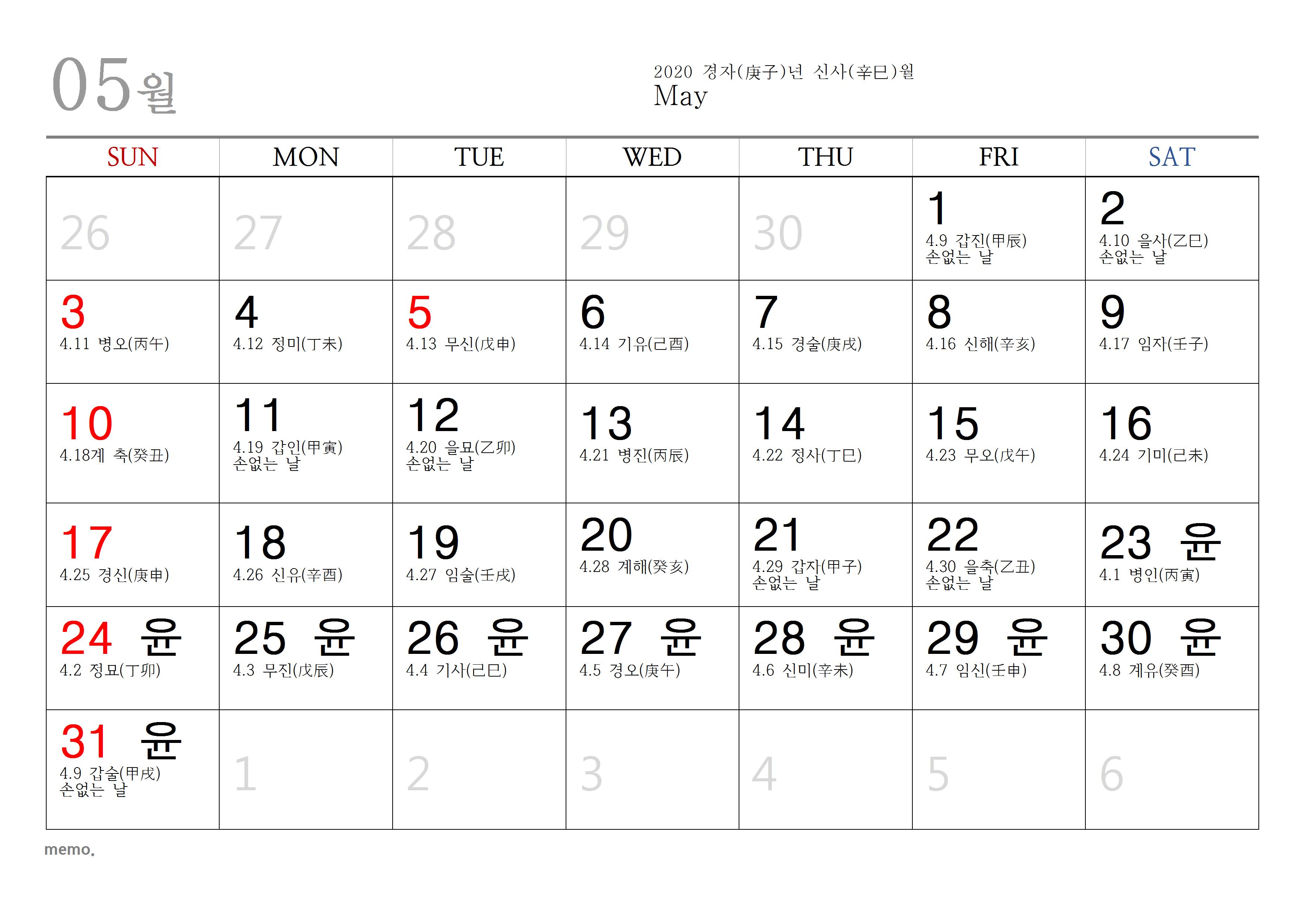 2020년 음력 간지 달력을 만들었습니다. 윤달과 손없는 날 기타 음력 날짜를 해당하는 한자 명칭도 같이 표기를 한 한글 달력 파일이며, 각 이미지 파일과 HWP 원본 및 PDF 및 직접 달력 만들기를 해볼 수 있는 아무것도 표기되어 있지 않는 달력까지 같이 첨부를 했습니다.