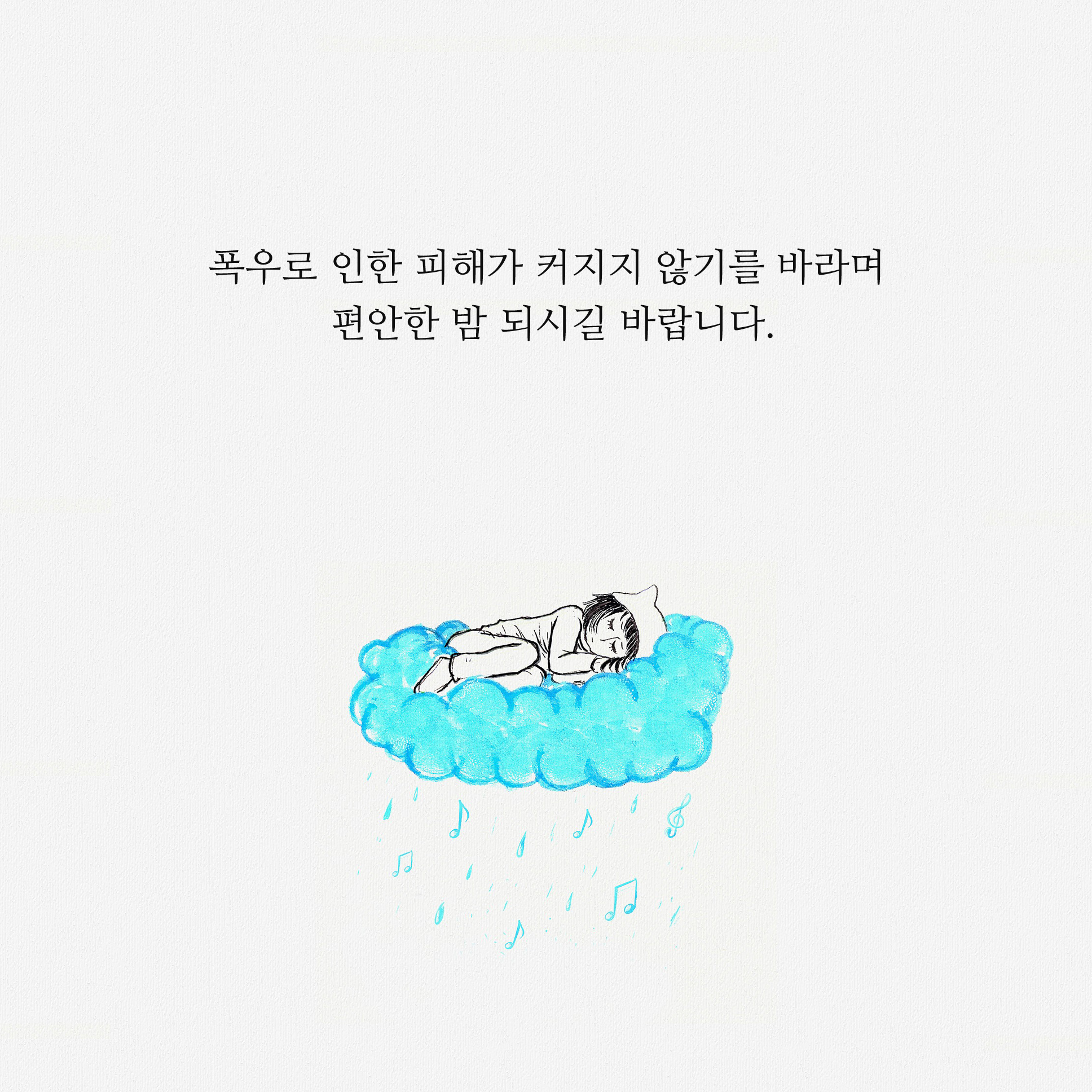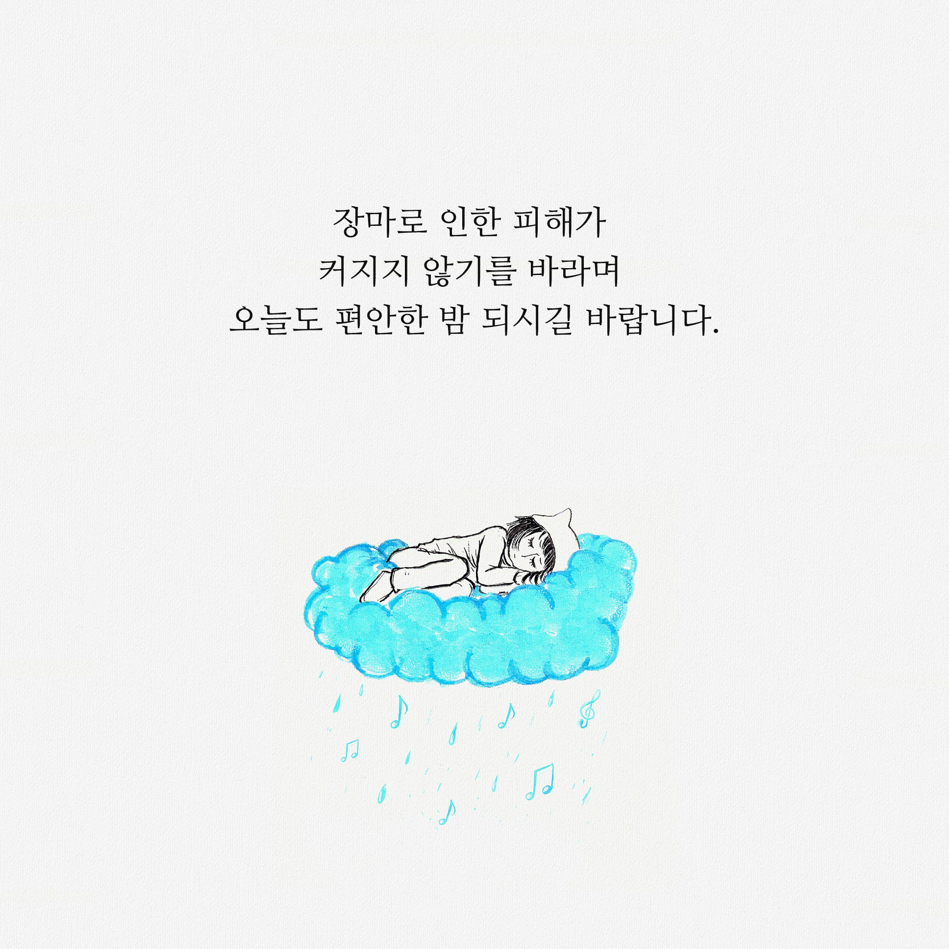 한동안 장마가 계속 이어질 것 같습니다. 장마로 인한 피해가 커지지 않기를 바라며 오늘은 빗소리를 들으며 편안한 휴식을 갖는 것도 좋을 것 같습니다. 오늘도 편안한 밤 되세요.