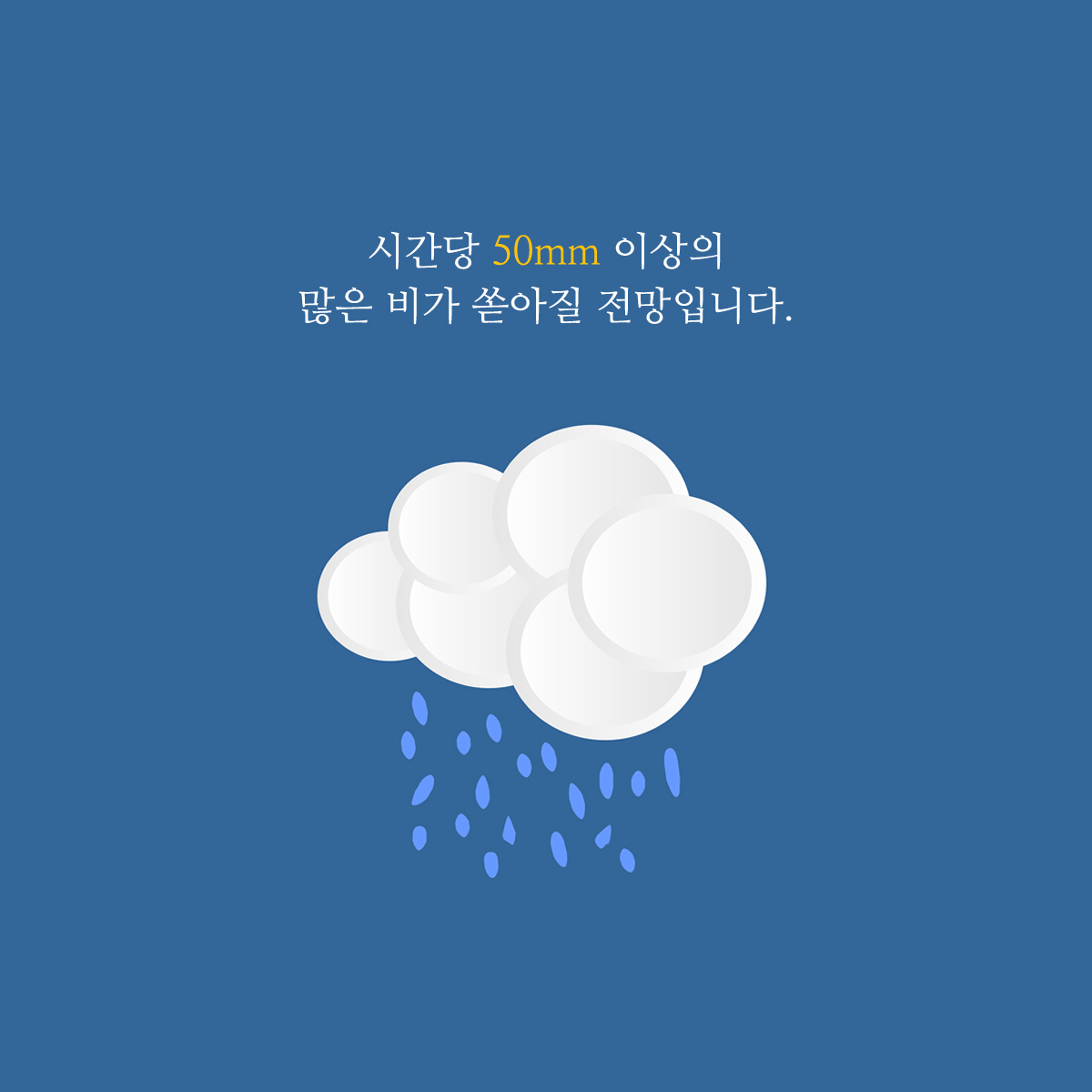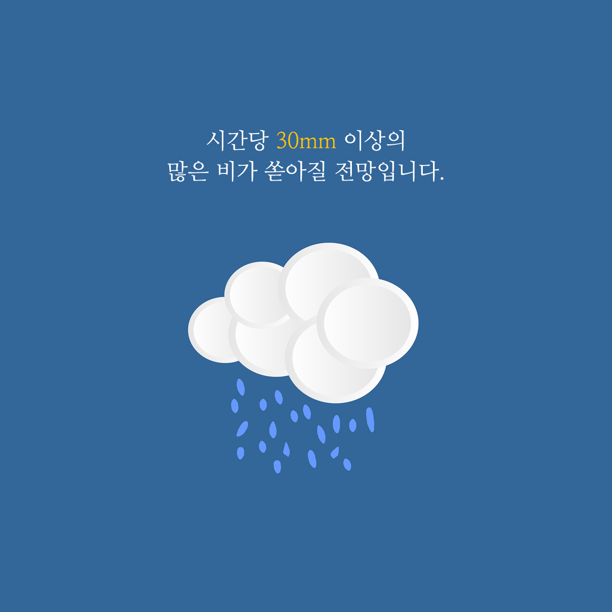 오늘은 시간당 30mm 이상의 많은 비가 쏟아질 전망입니다. 외출 시 우산을 꼭 챙기시길 바라며 주변을 잘 살피시고 운전 중에는 서행 운전하셔서 폭우로 인한 피해 없으셨으면 합니다.
