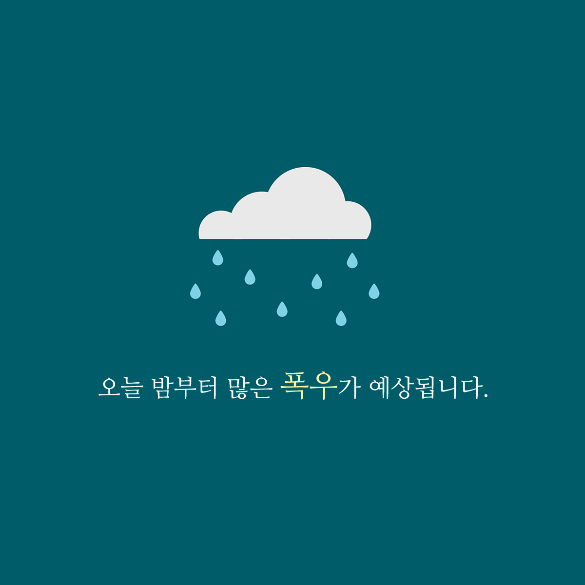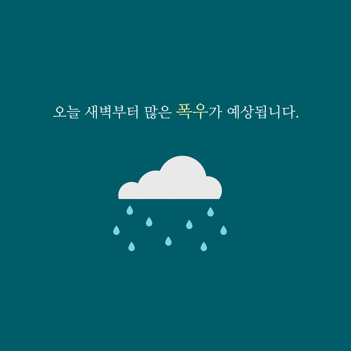 오늘은 전국적으로 많은 폭우 소식이 있습니다. 외출 시에는 주변을 잘 살피시고 우산을 꼭 챙기시길 바라며 주무시기 전 창문을 꼭 닫으시길 바랍니다. 오늘도 꿉꿉하고 습하지만 마음만큼은 좋은 기분을 잘 유지하셔서 많은 성과를 내셨으면 좋겠습니다. 오늘도 행복한 하루 보내세요.