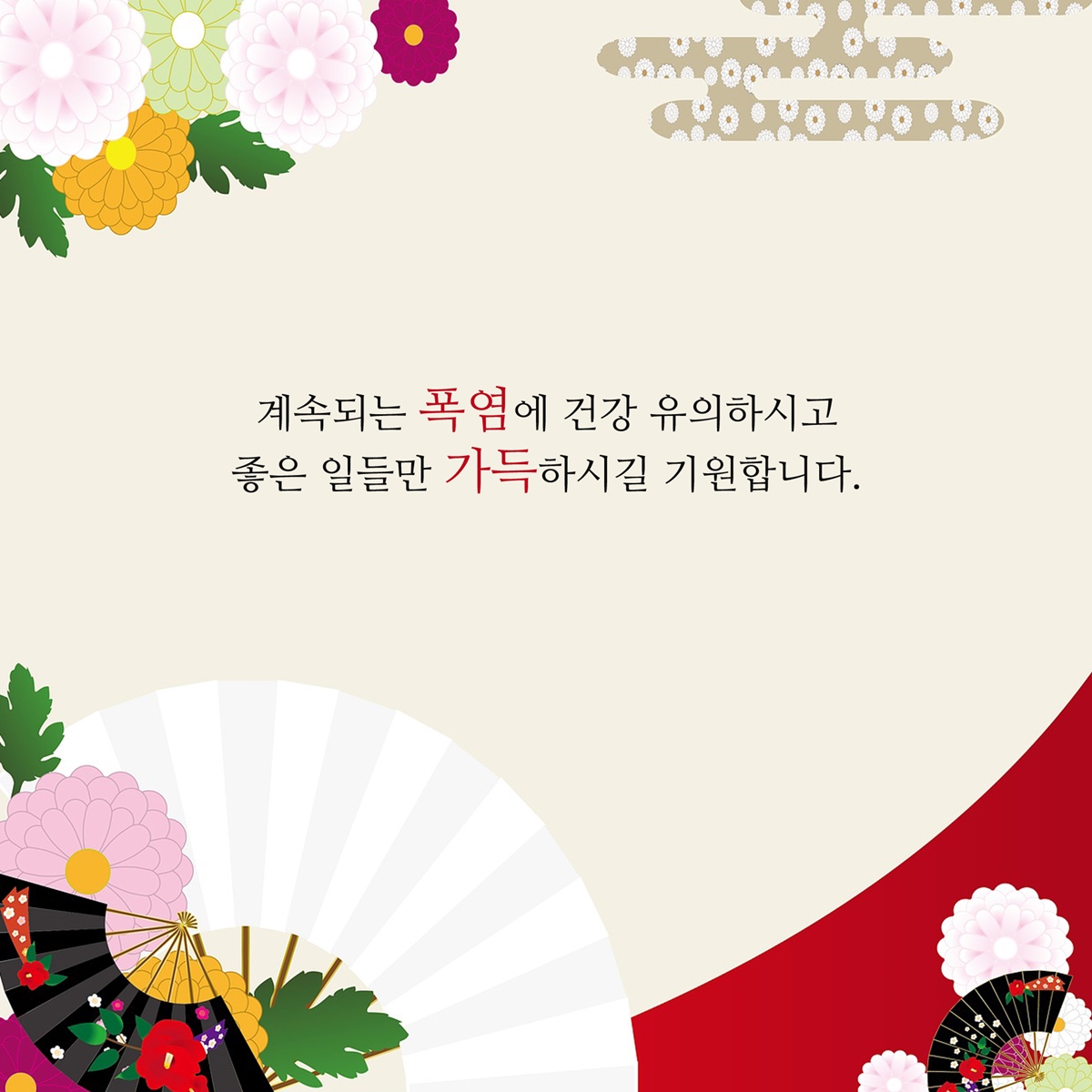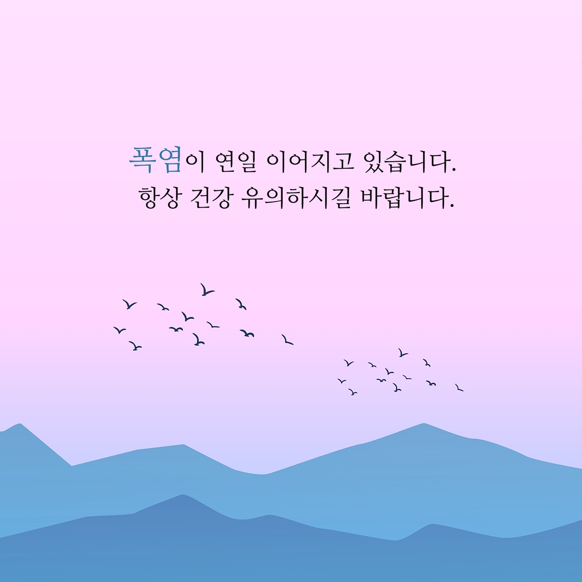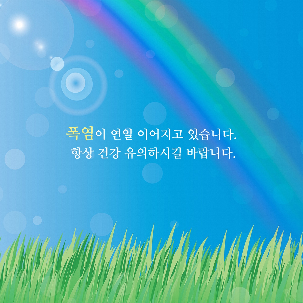 ■ 더운 날씨가 계속 이어지고 있습니다. 항상 건강 관리에 신경 쓰셔서 남은 여름 계절도 활기차게 보내셨으면 좋겠습니다.