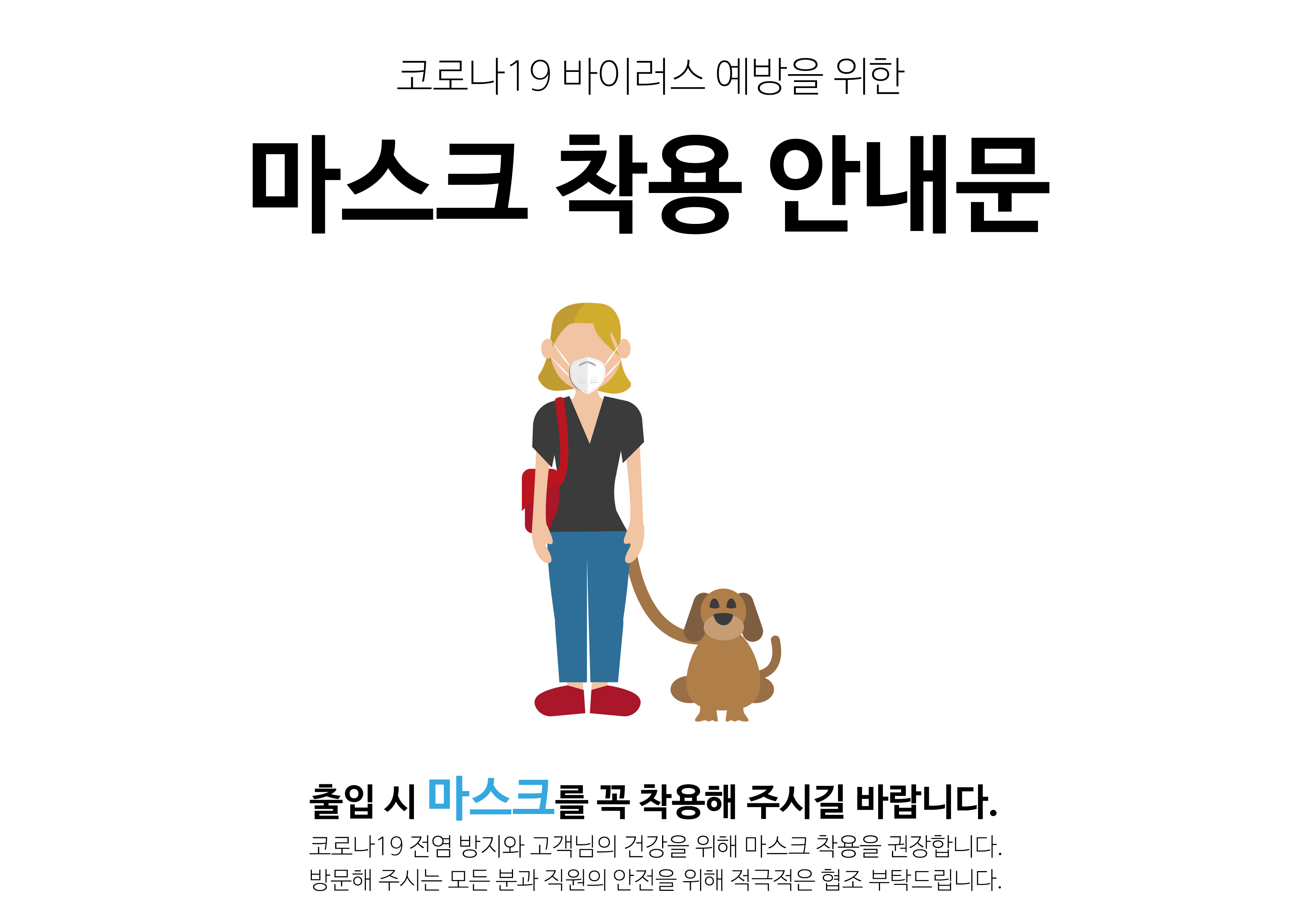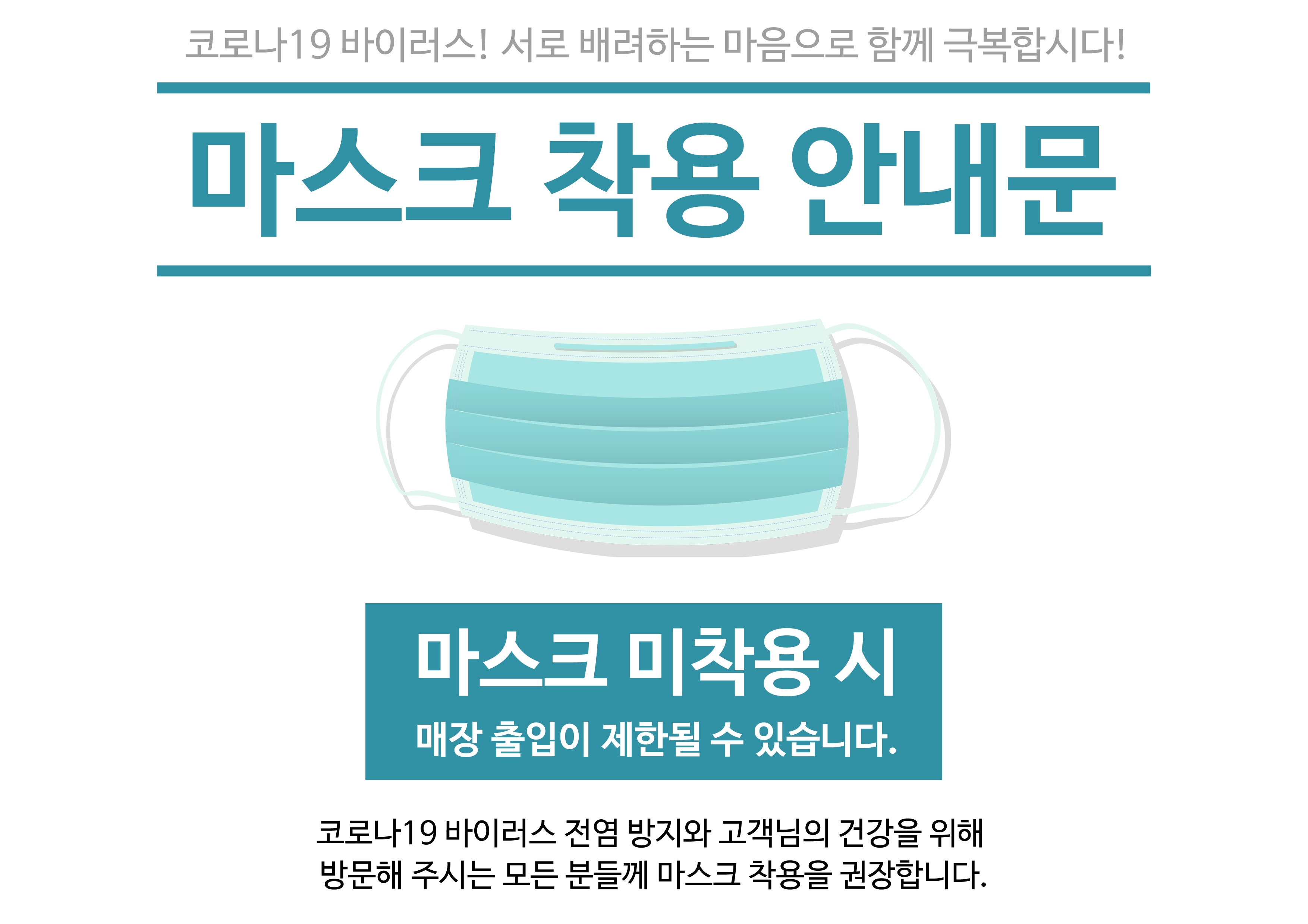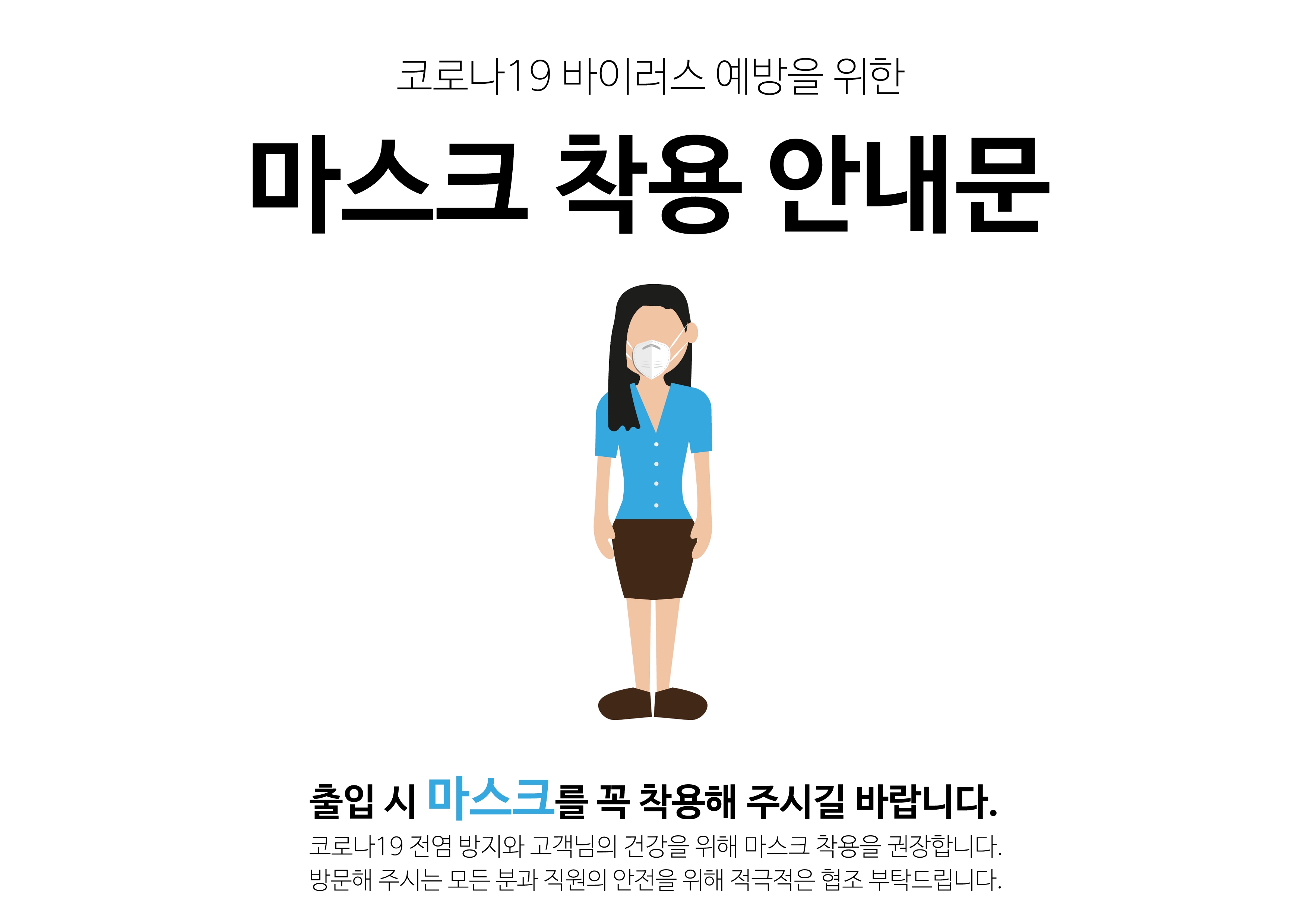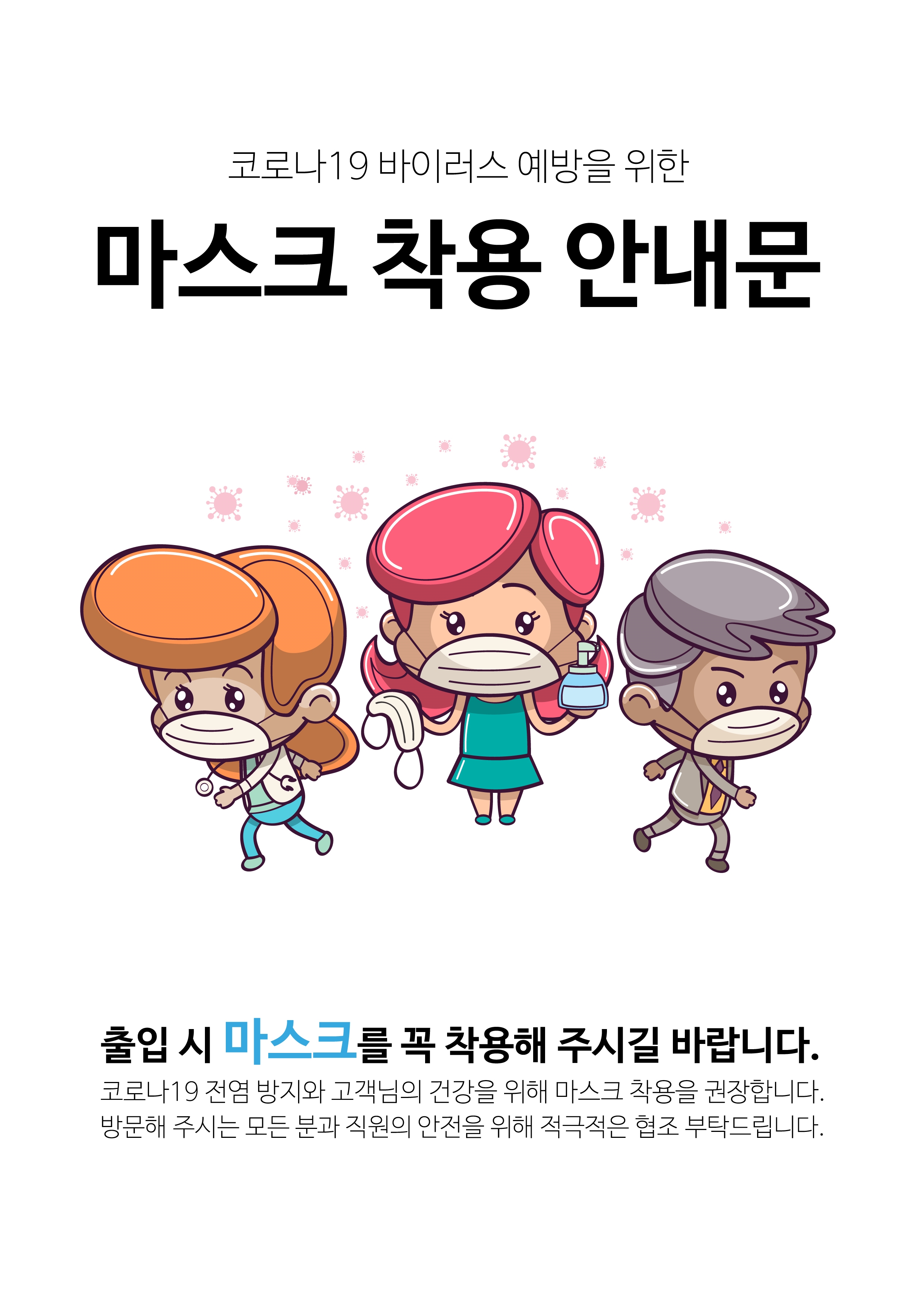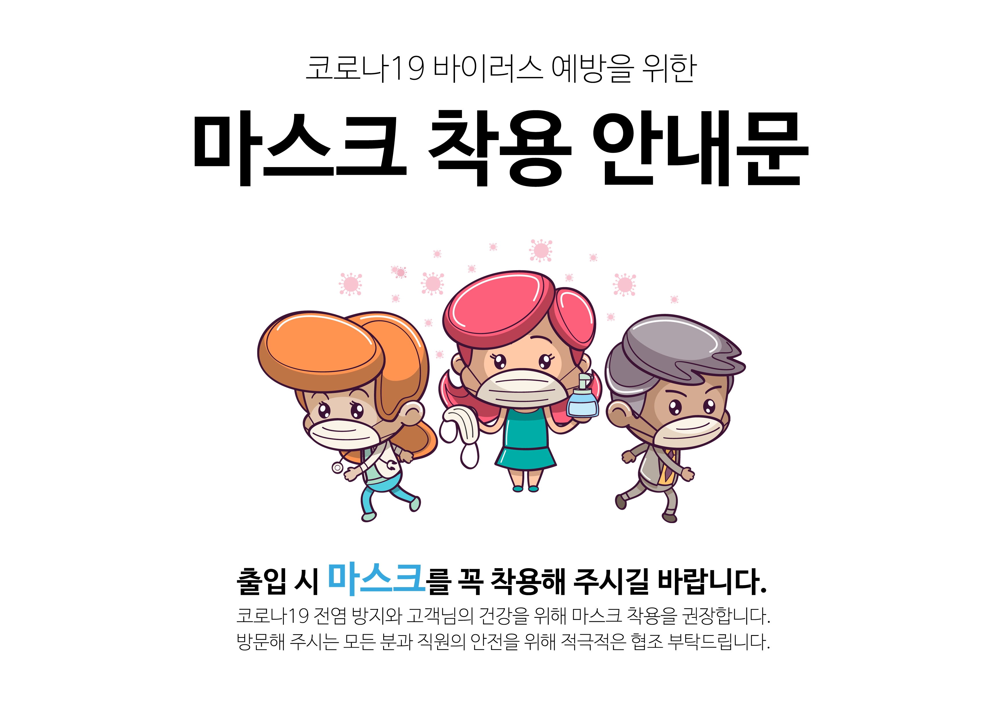 각각 마스크를 쓴 사람이 총 3명의 다양한 느낌으로 표현되었으며, 출입 시 마스크를 꼭 착용해 주시길 바란다는 내용이 들어가 있는 안내문입니다. 너무 길어진 스크롤을 줄이기 위해서 연달아서 세 개를 올렸기 때문에 글씨가 작게 보이지만 아래쪽에 옅은 회색으로 된 내용은 '코로나19 전염 방지와 고객님의 건강을 위해 마스크 착용을 권장합니다. 방문해 주시는 모든 분과 직원의 안전을 위해 적극적인 협조 부탁드립니다.'라고 적혀 있습니다.