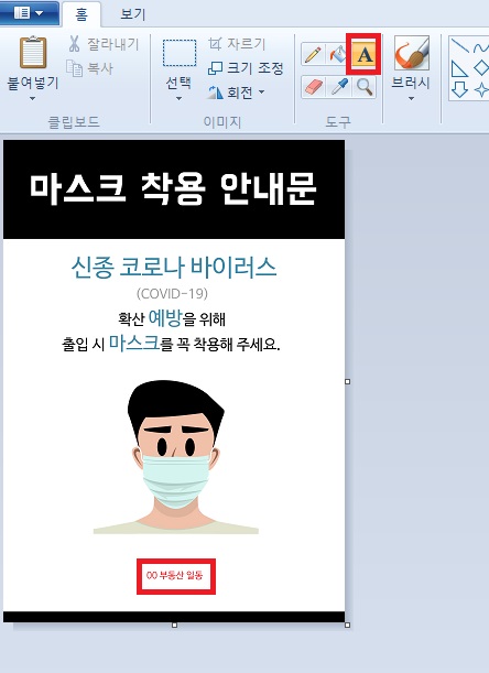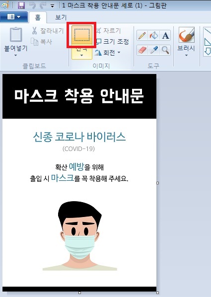 혹시라도 하단에 단체 명칭이나 매장의 상호나 이름, 로고를 넣고자 하시는 분들은 모든 컴퓨터에 깔려있는 그림판으로 쉽게 넣을 수 있지 않을까 싶은데요. 그러기 위해서는 각각의 포스터 이미지를 조금씩 위로 올려서 여백의 공간을 만든 다음 그 여백에 상호나 이름을 넣으면 되는데요. 우선 그림판을 켜신 다음에 해당 안내문 이미지를 그림판으로 끌어서 드래그를 하신 다음에 첫 번째처럼 점선으로 되어 있는 도구 표시가 있습니다. 그것을 누른 뒤 두 번째처럼 위치를 변경할 이미지를 드래그하신 다음 키보드에 있는 방향 키(위 또는 아래)를 누르시면 위치가 위 아래로 변경이 됩니다. 마찬가지로 다른 문구들도 조금씩 위로 올린 다음에 여백의 공간을 만든 후 세 번째처럼 텍스트를 입력할 수 있는 도구를 누른 뒤 원하는 위치에 클릭한 다음 단체나 이름이나 단체 명을 넣으면 될 것 같습니다.