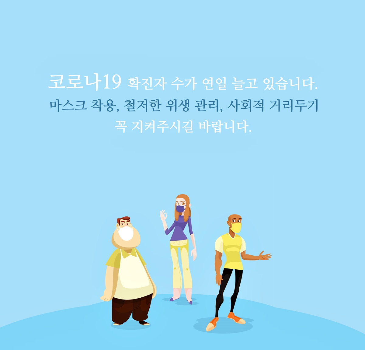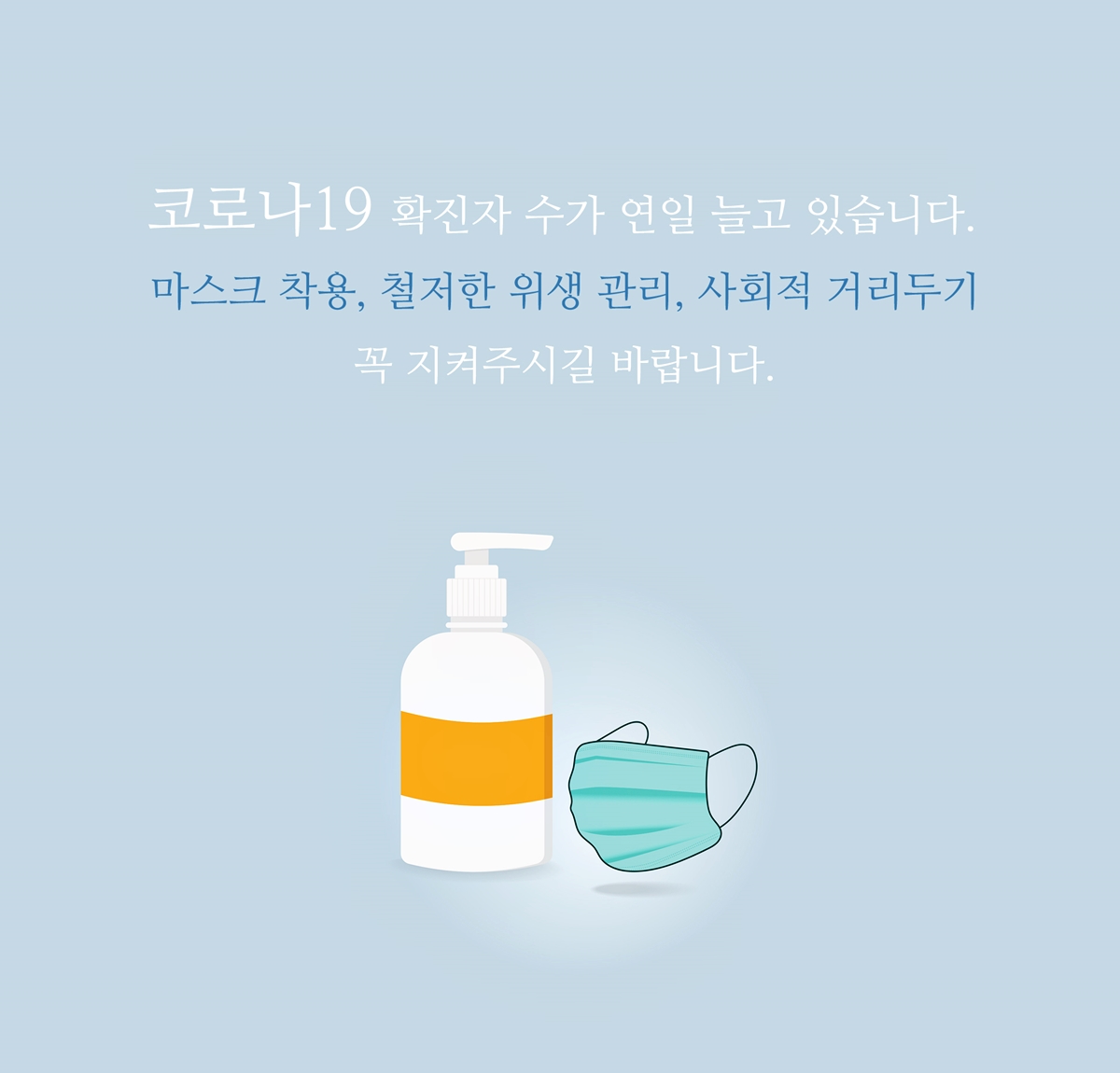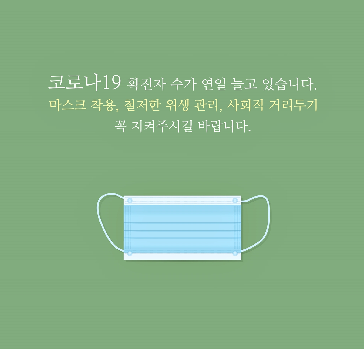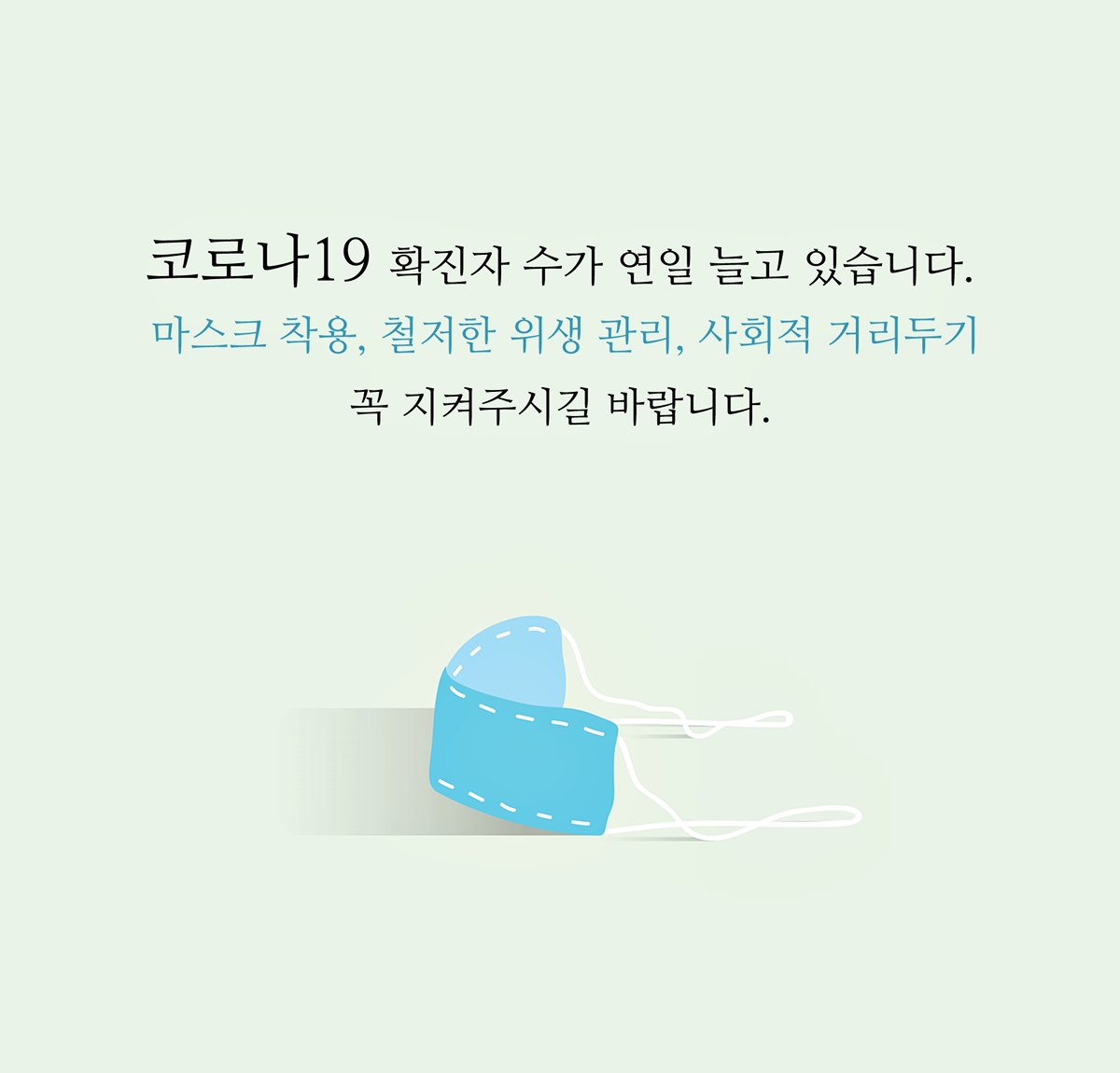 코로나19 확진사 수가 연일 늘고 있습니다. 마스크 착용과 철저한 위생관리 및 사회적 거리두기를 꼭 지켜주셔서 내 건강은 물론 가족 모두의 건강도 지키셨으면 좋겠습니다. 항상 건강하시고 행복하시길 기원합니다.