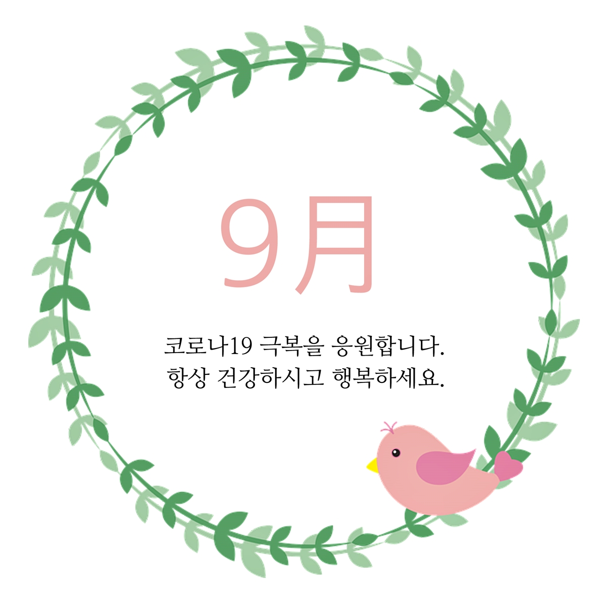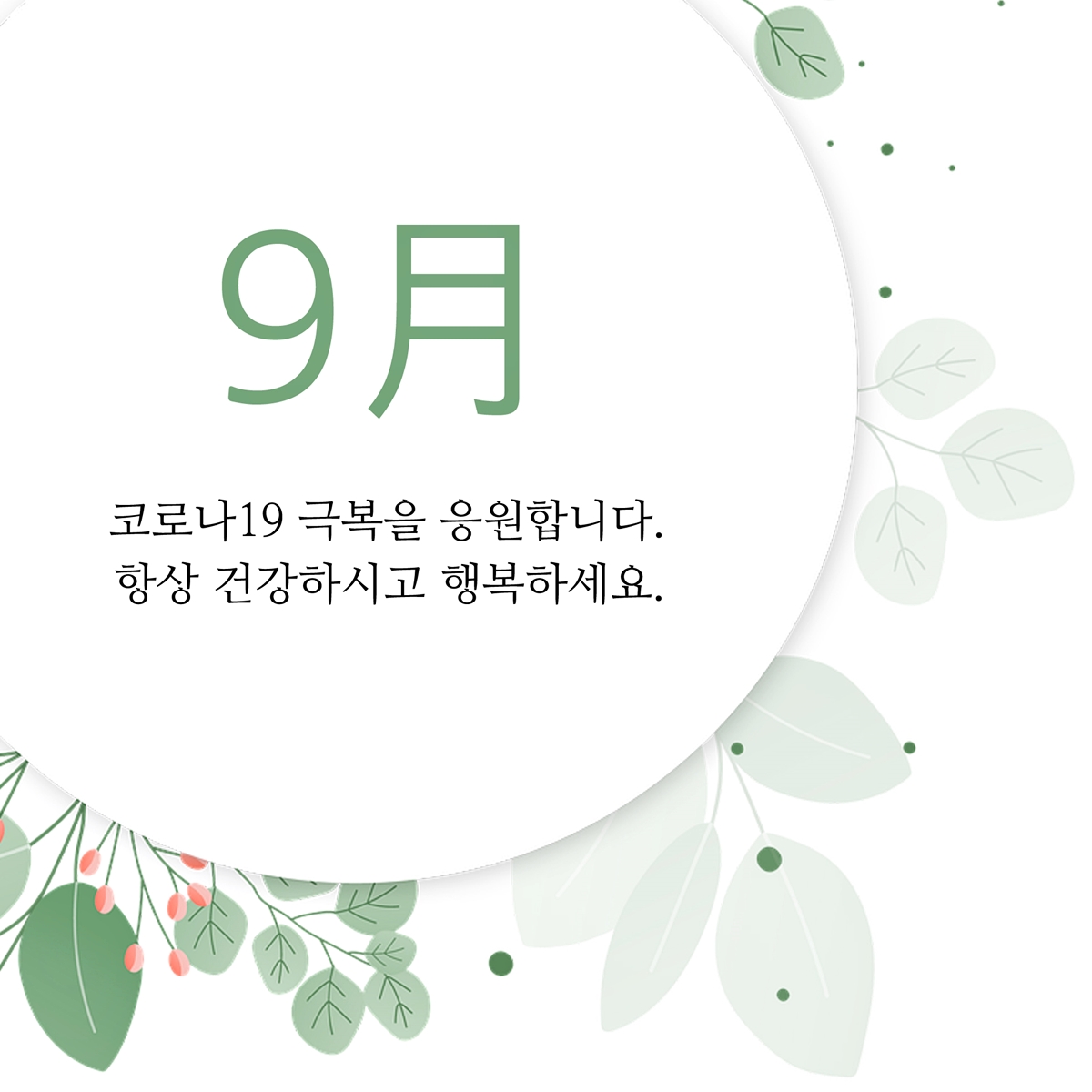 이제 9월이 시작되었습니다. 환절기에 접어드는 계절이니 만큼 주기적인 운동, 충분한 수분 섭취, 체온 유지로 이번 가을도 건강하게 보내셨으면 좋겠습니다. 늘 행복하시길 바라며 항상 응원합니다.