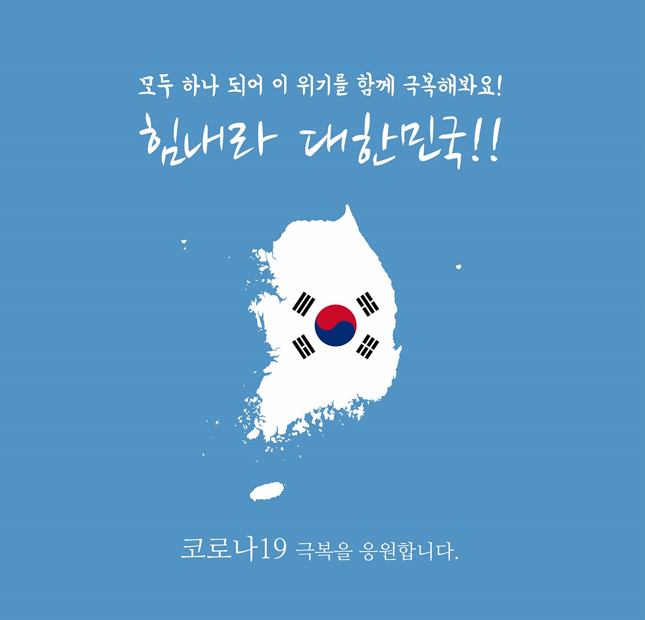 모두가 하나 되어 이 위기를 함께 극복하자는 내용을 담은 '힘내라 대한민국!'이라는 문구를 조금 더 강한 포인트를 준 코로나 응원메세지입니다. 한반도에 태극기가 들어가 있어서 모든 국민에게 힘을 내라는 메세지를 담고 싶었습니다.